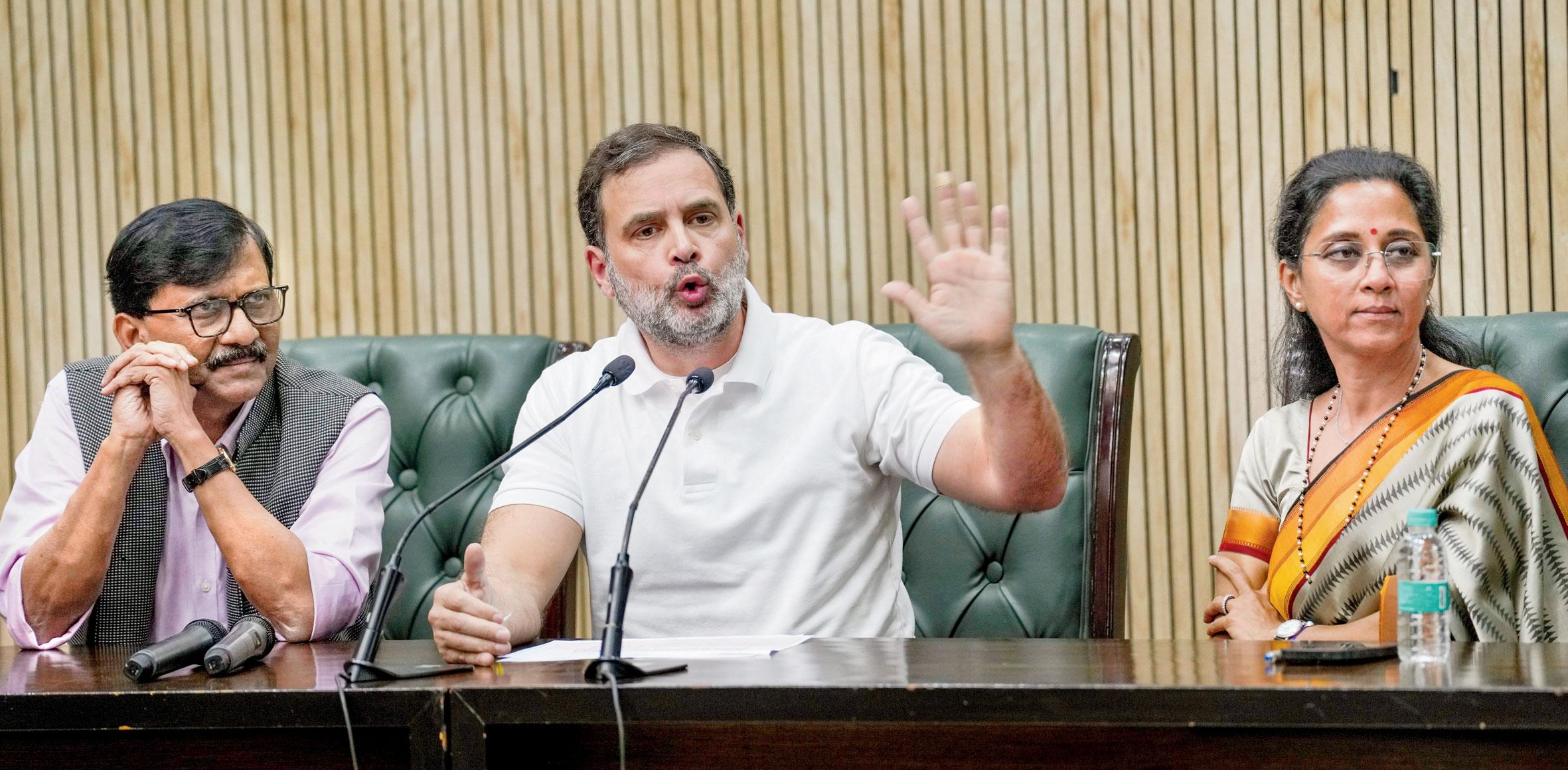 ઉદ્ધવસેના અને NCPનાં સુપ્રિયા સુળે સાથે સંયુક્ત પત્રકાર-પરિષદમાં રાહુલ ગાંધીએ કહ્યું હતું કે ‘અમે પુરાવા વગર આરોપ નથી કરી રહ્યા. ચૂંટણીપંચે અમારી ચિંતાઓનો જવાબ નથી આપ્યો. અમે સમગ્ર વિપક્ષનું પ્રતિનિધિત્વ કરીએ છીએ જે મહારાષ્ટ્રમાં છેલ્લી ચૂંટણી લડ્યા હતા. અમે મહારાષ્ટ્રની ચૂંટણીને લગતી કેટલીક મહત્ત્વપૂર્ણ માહિતીથી ભારતના લોકોનું ધ્યાન દોરવા માગીએ છીએ.’