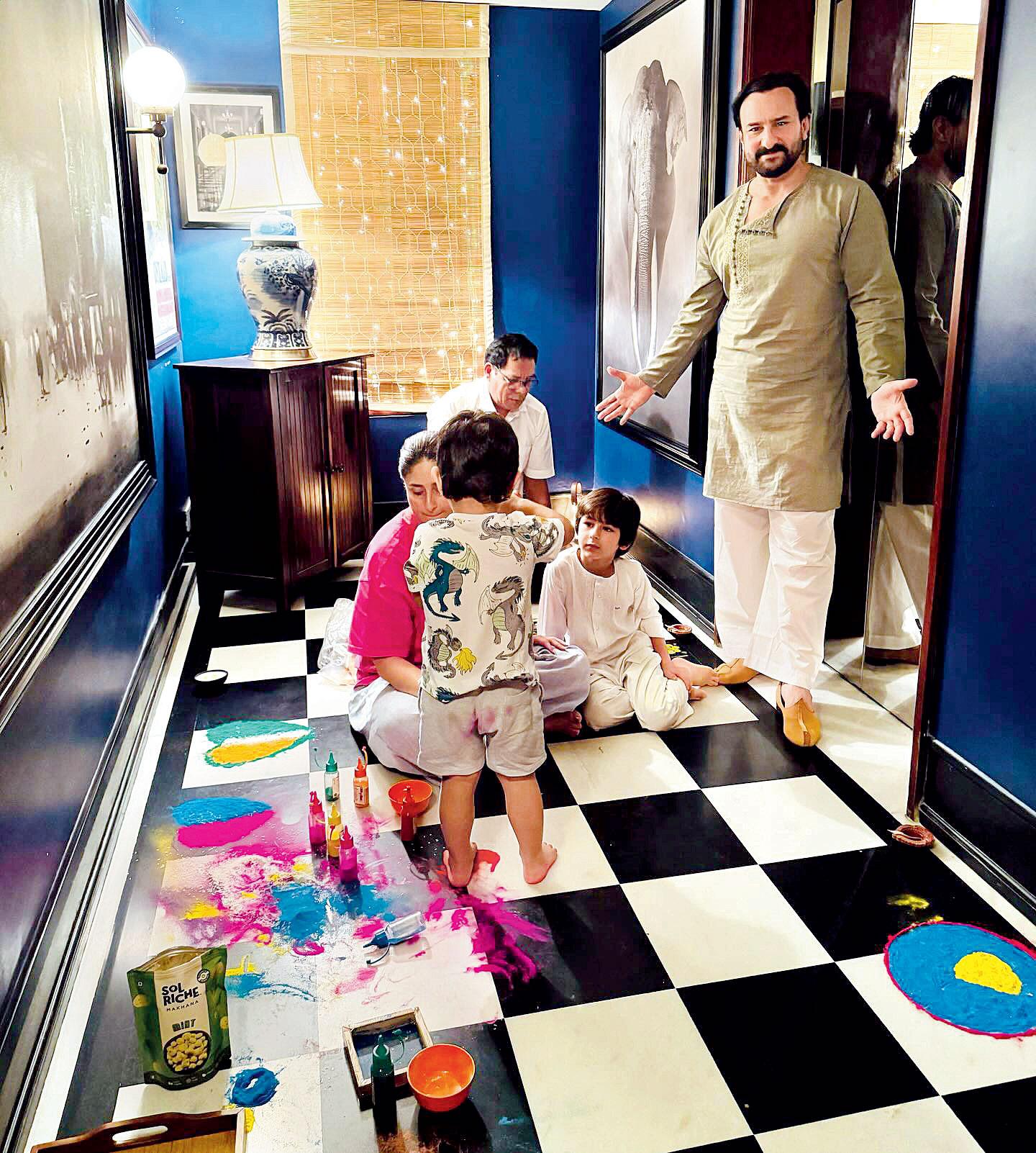 કરીના કપૂર ખાને તેના બે દીકરાઓ તૈમુર અને જેહ સાથે રંગોળી બનાવવાનો પ્રયત્ન કર્યો હતો, પરંતુ તેના દીકરાઓએ રંગ સાથે રમવાનું વધુ પસંદ કર્યું હતું. એનો ફોટો કરીનાએ શૅર કર્યો છે. એમાં દેખાય છે કે કરીના તેના બે દીકરાઓ સાથે જમીન પર બેઠી છે અને બાજુમાં રંગોળી વિખેરાયેલી છે. કરીના રંગોળી જોઈને વિચાર કરતી હોય એવું લાગી રહ્યું છે. બીજા એક ફોટોમાં જેહ રંગ સાથે રમી રહ્યો છે. આ ફોટોને ઇન્સ્ટાગ્રામ પર શૅર કરીને કરીનાએ કૅપ્શન આપી હતી, ‘ઐયો, પરિવાર જ્યારે નક્કી કરે કે રંગોળી બનાવવી કે હોળી રમવી છે, કાંઈ સમજ નથી પડતી. જે કાંઈ પણ હોય, પરંતુ અમને ખૂબ મજા પડી. ચાલો દિવાળી ઊજવવાની શરૂઆત કરીએ.’