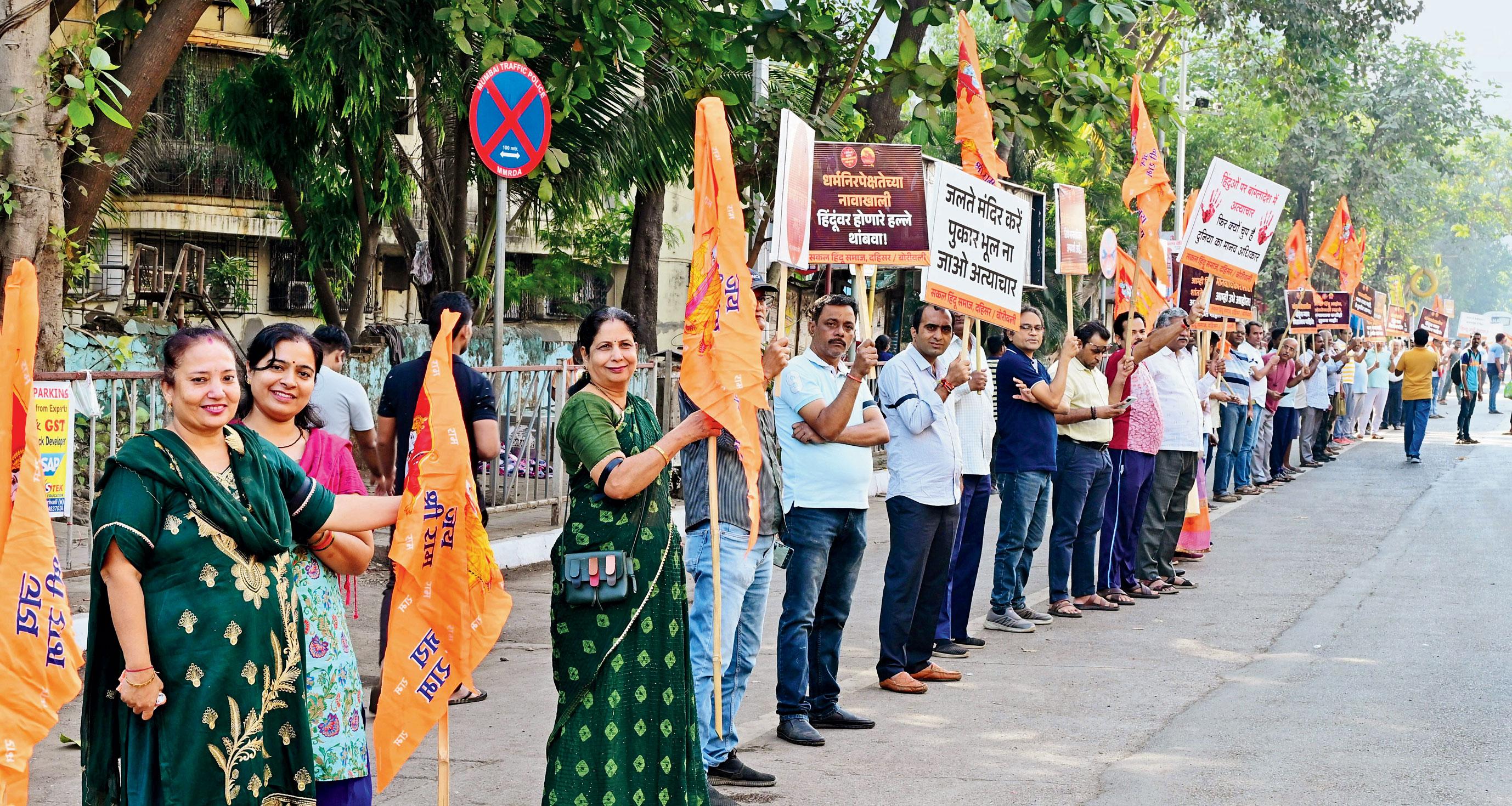 બંગલાદેશમાં હિન્દુઓ પર સતત કરવામાં આવી રહેલા હુમલાના વિરોધમાં ગઈ કાલે મુંબઈ સહિત આસપાસના વિસ્તારોમાં વિવિધ હિન્દુ સંગઠનો દ્વારા વિરોધ-પ્રદર્શન કરવાની સાથે મોરચા કાઢવામાં આવ્યા હતા. બોરીવલી-ઈસ્ટમાં નૅશનલ પાર્કથી લઈને કાંદિવલીના ઠાકુર કૉમ્પ્લેક્સ સુધી વિરોધ-પ્રદર્શન કરવા માટે માનવસાંકળ રચવામાં આવી હતી. ભાઈંદર-ઈસ્ટમાં ગોલ્ડન સર્કલ પાસે સકલ હિન્દુ સમાજ દ્વારા બંગલાદેશની ઘટનાનો નિષેધ કરવામાં આવ્યો હતો.