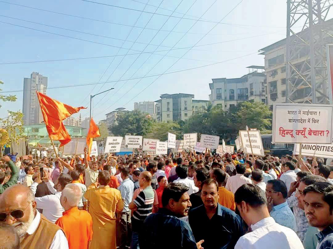 બંગલાદેશમાં હિન્દુઓ પર સતત કરવામાં આવી રહેલા હુમલાના વિરોધમાં ગઈ કાલે મુંબઈ સહિત આસપાસના વિસ્તારોમાં વિવિધ હિન્દુ સંગઠનો દ્વારા વિરોધ-પ્રદર્શન કરવાની સાથે મોરચા કાઢવામાં આવ્યા હતા.