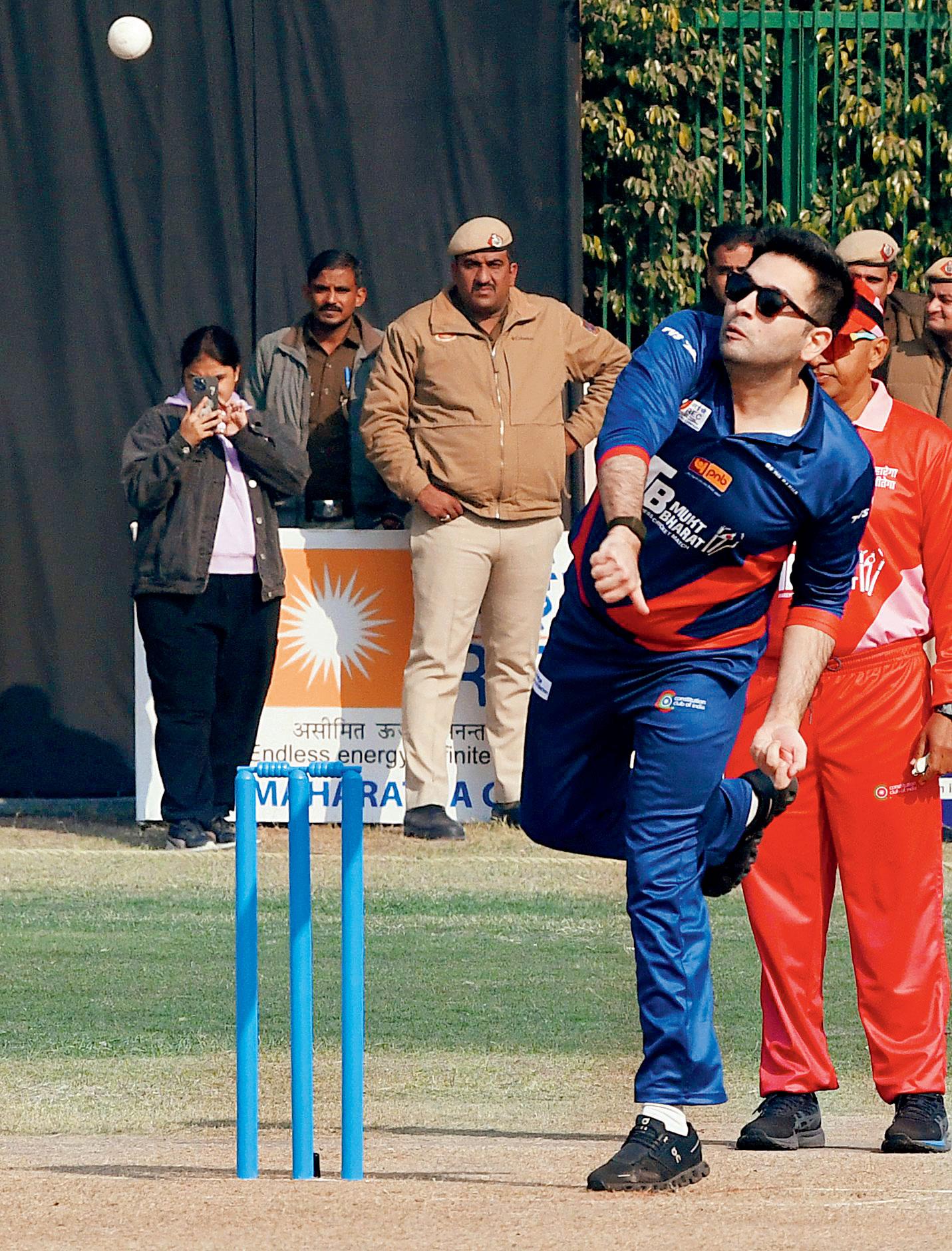 બોલિંગ કરતા આમ આદમી પાર્ટીના સંસદસભ્ય રાઘવ ચઢ્ઢા.