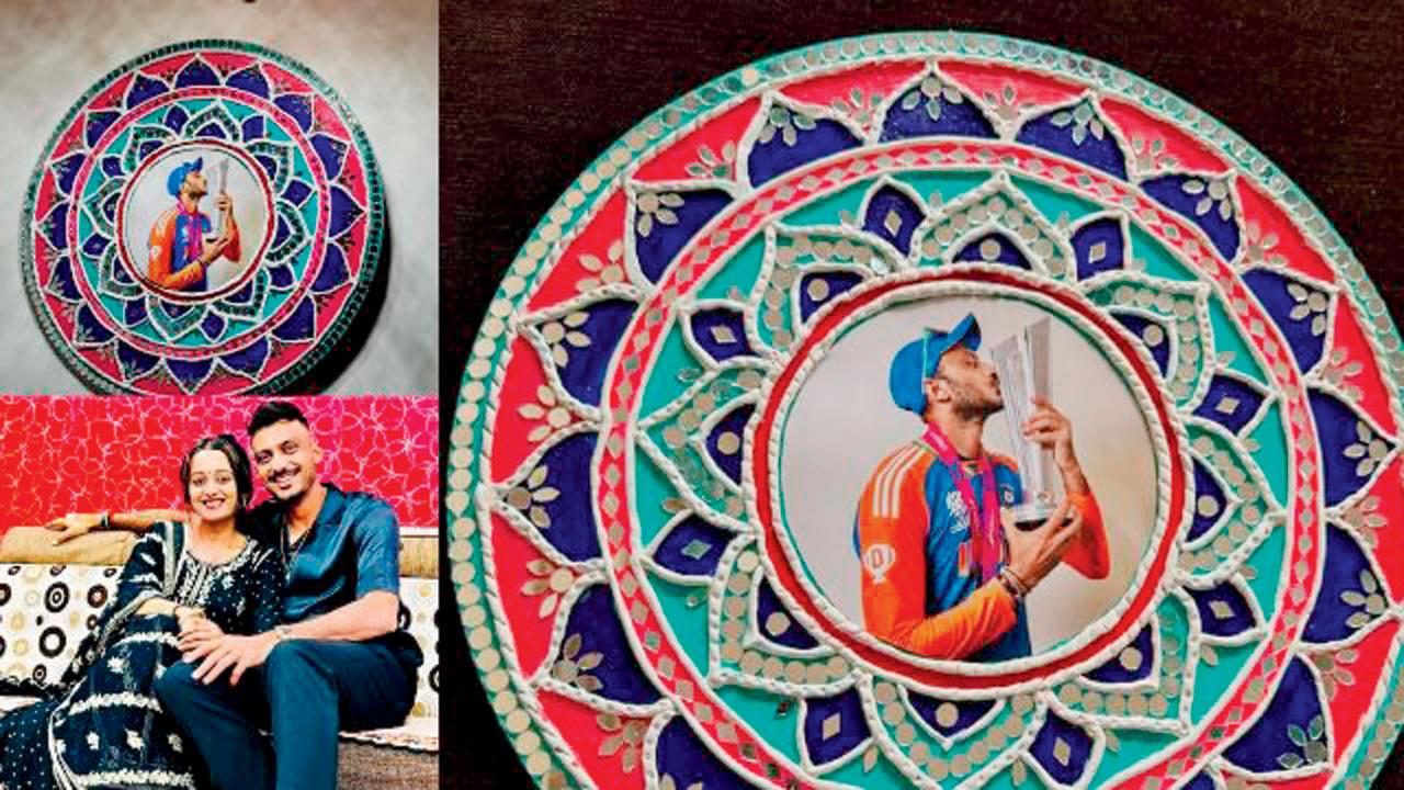 અક્ષર પટેલની પત્ની મેહા પટેલે સોશ્યલ મીડિયા પર કેટલીક ખાસ તસવીર શૅર કરી છે જેમાં તેણે તૈયાર કરેલી કલાકારીગરી જોવા મળી હતી. તેણે અક્ષર પટેલના વર્લ્ડ કપ સાથેના ફોટોની મદદથી મસ્ત આર્ટવર્ક તૈયાર કર્યું હતું.