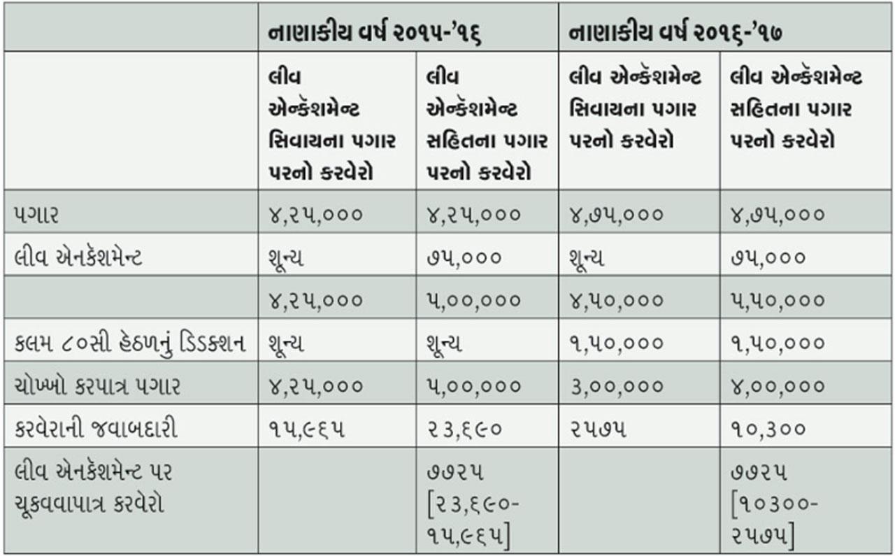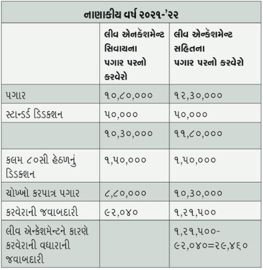 આ રકમ મળે તો ખરી, પરંતુ પ્રવર્તમાન વર્ષમાં કર્મચારીએ એના પર વધારે કરવેરો ચૂકવવો પડતો હોય છે. આ સ્થિતિમાં કરવેરાનો બોજ વધારે થાય નહીં એ માટે આવકવેરા ધારાની કલમ ૮૯ હેઠળ રાહત આપવામાં આવી છે. દા.ત. અનુરાધા કંપની એબીસી માટે કામ કરે છે. તેનો માસિક પગાર ૯૦,૦૦૦ રૂપિયા છે. એ કંપની દર વર્ષે રજા તરીકે ૩૫ દિવસ જમા કરે છે. માર્ચ ૨૦૨૨માં અનુરાધાએ વર્ષ ૨૦૧૫-’૧૬ની ૨૫ અને વર્ષ ૨૦૧૬-’૧૭ની ૨૫ મળીને કુલ ૫૦ રજાઓ એન્કૅશ કરી. એના તેને ૧,૫૦,૦૦૦ રૂપિયા મળ્યા.
