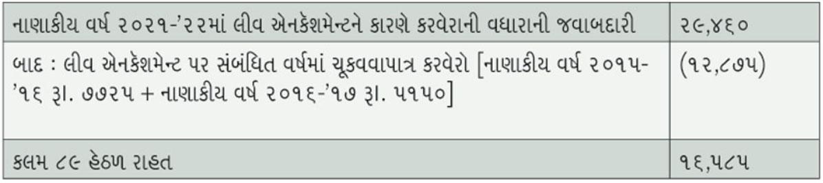 સર્વિસ દરમિયાન એન્કૅશ કરાયેલી રજાઓની રકમ સંપૂર્ણપણે કરપાત્ર હોય છે. આથી એને પગારની આવકમાં સામેલ કરવામાં આવે છે. અનુરાધાને લીવ એનકૅશમેન્ટને કારણે મળેલી વધારાની રકમને લીધે વધારે કર ભરવાનો આવે છે. આપણે અગાઉ કહ્યું એમ કલમ ૮૯ હેઠળ રાહત મળે છે. એ કેવી રીતે લાગુ પડે છે એની ગણતરી જોઈએ.
