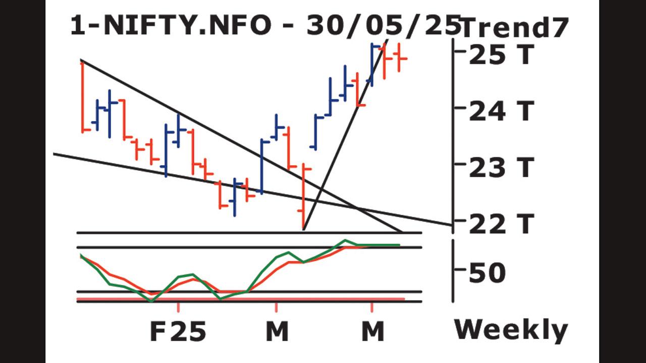 નિફ્ટી ફ્યુચર દૈનિક ધોરણે ટૂંકા ગાળાનો પ્રવાહ નરમાઈતરફી અને અઠવાડિક ધોરણે મધ્યમ ગાળાનો પ્રવાહ સુધારાતરફી છે તેમ જ માસિક ધોરણે લાંબા ગાળાનો પ્રવાહ પણ સુધારાતરફી છે. લાંબા ગાળાનો સપોર્ટ ૨૧,૨૬૫ ગણાય. (શરૂઆતમાં બ્રોડનિંગ ફૉર્મેશન પ્રમાણે એકબીજાથી દૂર જતી ટ્રેન્ડ લાઇન અને પછી સિમેટ્રિકલ ટ્રાયેન્ગલની જેમ એકબીજા તરફ સંકડાતી જતી ટ્રેન્ડ લાઇન દોરવામાં આવે છે. આ પૅટર્ન સામાન્ય રીતે કન્ટિન્યુએશન પૅટર્ન તરીકે નહીં, પણ રીવર્સલ પૅટર્ન તરીકે ગણાય છે. જ્યારે પૅટર્નના બીજા ભાગમાં ટ્રેન્ડ લાઇનમાંથી નીચેની તરફ બ્રેકઆઉટ આવે છે ત્યારે પૅટર્ન પૂર્ણ થાય છે.) (ક્રમશઃ) નિફ્ટી ફ્યુચરની ટૂંકા ગાળાની ઍવરેજ ૨૪,૮૦૩.૦૦ છે જે ક્લોઝિંગ પ્રાઇસના આધારે રોજ બદલાયા કરે છે.
