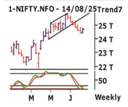 ૨૫,૭૯૨.૪૦ના ટૉપથી નરમાઈતરફી છે. દૈનિક ધોરણે ન્યુટ્રલ, અઠવાડિક ધોરણે ઓવરસોલ્ડ તેમ જ માસિક ધોરણે ઓવરબૉટ પોઝિશન દર્શાવે છે. ઉપરમાં ૨૪,૭૦૫, ૨૪,૭૬૫ ઉપર ૨૪,૮૧૩ કુદાવે તો સુધારો જોવાશે. ૨૪,૮૧૩ ઉપર ૨૪,૮૮૦, ૨૪,૯૩૫, ૨૫,૦૧૫, ૨૫,૧૦૦, ૨૫,૧૯૦, ૨૫,૨૭૦ સુધીની શક્યતા. નીચામાં ૨૪,૫૪૦ નીચે ૨૪,૪૯૫, ૨૪,૪૦૯ મહત્ત્વનો સપોર્ટ ગણાય. આ સાથે અઠવાડિક ચાર્ટ આપ્યો છે.