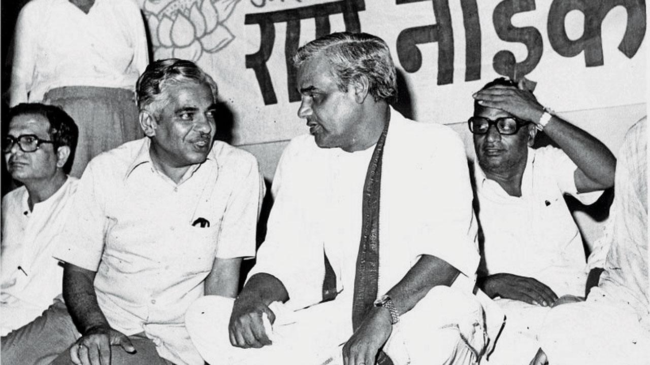 ૧૯૮૦માં મુંબઈના મહાલક્ષ્મી રેસકોર્સમાં યોજાયેલા ભારતીય જનતા પાર્ટીના પહેલા અધિવેશનમાં સ્ટેજ પરથી ભાષણ આપી રહેલા અટલ બિહારી વાજપેયી અને સ્ટેજની પૅનલમાં રામ નાઈક.