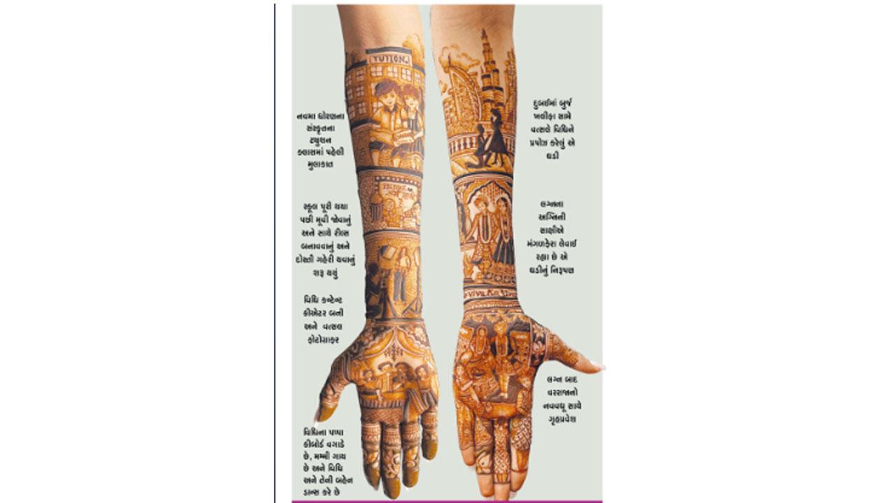 લગ્નમાં કસ્ટમાઇઝેશનનો ટ્રેન્ડ વધ્યો છે ત્યારે ખાસ કરીને મેંદીમાં પણ બ્રાઇડ્સ પોતાની આખેઆખી લવસ્ટોરીઝ ઉતારાવે છે. મુલુંડમાં રહેતી સોશ્યલ મીડિયા ઇન્ફ્લુઅન્સર વિધિ શાહે પણ તેની બ્રાઇડલ મેંદી આવી જ રીતે કરાવી હતી. મેંદી માટેના યુનિક કન્સેપ્ટને ડેવલપ કરવાથી લઈને હાથ પર ઉતારવા સુધીની સફર વિશે વિધિ પાસેથી જ જાણીએ.