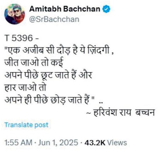 થોડા દિવસો પહેલાં અમિતાભ બચ્ચને ઘણા દિવસો સુધી સોશ્યલ મીડિયા પર બ્લૅન્ક પોસ્ટ મૂકી હતી જેના કારણે તેઓ ટ્રોલ થઈ ગયા હતા. હવે તેઓ સોશ્યલ મીડિયા પર અને પોતાના બ્લૉગ પર સક્રિય બની ગયા છે. હાલમાં તેમની સોશ્યલ મીડિયા પરની પોસ્ટ ચર્ચાસ્પદ બની છે જેમાં તેમણે પોતાના પિતા હરિવંશરાય બચ્ચનની હિન્દી કવિતા મૂકી છે જેનો મતલબ થાય છે કે ‘એક વિચિત્ર દોડ છે આ જીવન, જીતી જાઓ તો ઘણા પોતાની પાછળ રહી જાય છે અને હારી જાઓ તો તમારા જ તમને પાછળ છોડી દે છે.’