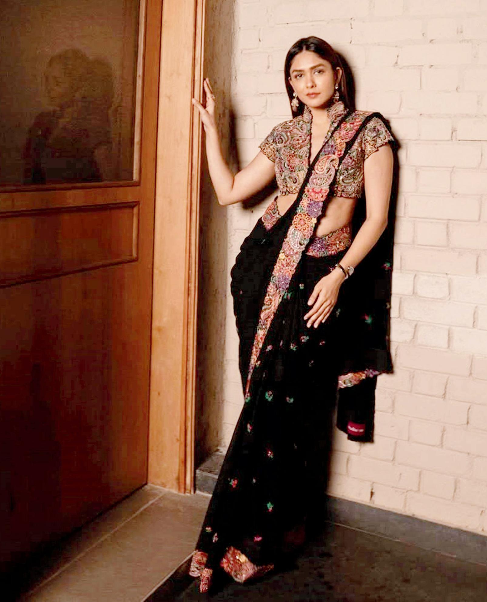 રશ્મિકા મંદાના અને વિજય દેવરકોંડાના ચોથી માર્ચે હૈદરાબાદમાં યોજાયેલા રિસેપ્શનમાં મૃણાલ ઠાકુરે જૅકેટ સ્ટાઇલના બ્લાઉઝ સાથે બ્લૅક સાડી પહેરી હતી. મૃણાલે પોતાના સોશ્યલ મીડિયામાં આ સાડી સાથેની તસવીરો પણ પોસ્ટ કરી છે અને એને ‘દેસી મૅજિક’ ગણાવી છે. મૃણાલનો આ સાડી-લુક ફૅન્સને બહુ પસંદ પડ્યો હતો. હકીકતમાં મૃણાલની આ સાડી ડિઝાઇનર મૃણાલિની રાવના ‘શ્યામા સાડી સેટ’નો હિસ્સો હતી અને એની કિંમત લગભગ ૨,૭૯,૦૦૦ રૂપિયા છે. આ બ્લૅક જ્યૉર્જેટ સાડીમાં રંગબેરંગી રેશમ હૅન્ડ-એમ્બ્રૉઇડરીવાળી સુંદર બૉર્ડર હતી. મૃણાલે સાડી સાથે રૉ સિલ્કનું ખાસ પ્રકારનું જૅકેટ-સ્ટાઇલ બ્લાઉઝ પહેર્યું હતું જેના કારણે આઉટફિટમાં પરંપરાગત કારીગરી અને આધુનિક સ્ટાઇલનું કૉમ્બિનેશન જોવા મળ્યું હતું.