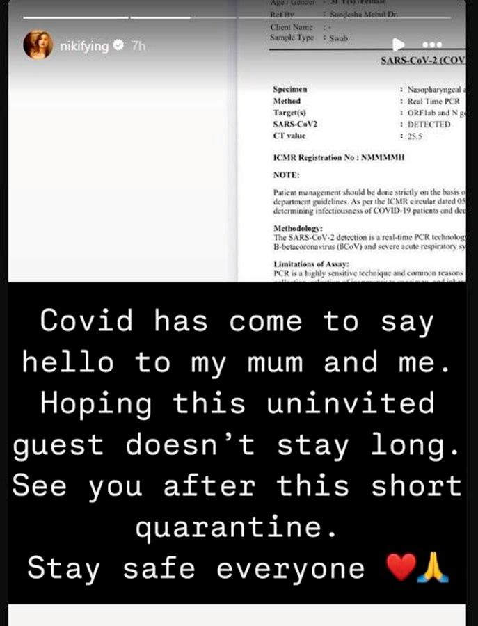 નિકિતા અને તેની મમ્મી હાલમાં ઘરે ક્વૉરન્ટીનમાં છે અને તેમને કોરોનાનાં હળવાં લક્ષણો છે.