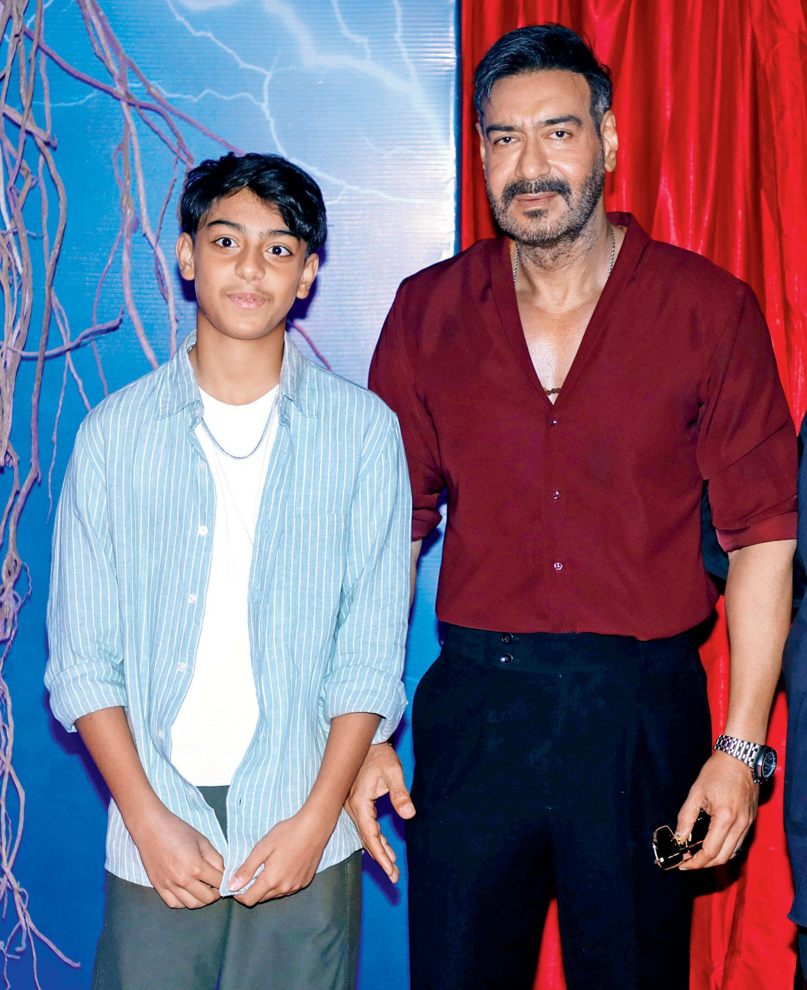 પોતાની આગામી માઇથોલૉજિકલ હૉરર ફિલ્મ ‘માં’નું ટ્રેલર લૉન્ચ કરવાની ઇવેન્ટમાં કાજોલ. દીકરો યુગ અને પતિ અજય દેવગન પણ આ પ્રસંગે હાજર હતા.