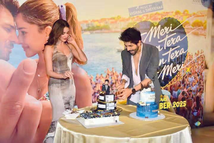 કાર્તિક માટે ગઈ કાલનો દિવસ બર્થ-ડે હોવાના કારણે તો ખાસ હતો જ, પણ સાથે-સાથે આ દિવસે તેની અને અનન્યા પાંડેની ૨૫ ડિસેમ્બરે રિલીઝ થનારી ફિલ્મ ‘તૂ મેરી મૈં તેરા, મૈં તેરા તૂ મેરી’નું ટીઝર પણ લૉન્ચ કરવામાં આવ્યું હોવાના કારણે કાર્તિક માટે આ દિવસ ડબલ સેલિબ્રેશન જેવો બની ગયો હતો. કાર્તિકે આ ટીઝર-લૉન્ચિંગની ગ્રૅન્ડ પાર્ટીમાં ફોટોગ્રાફર્સ અને ફિલ્મની લીડ ઍક્ટ્રેસ અનન્યા પાંડે સાથે બર્થ-ડે કેક કટ કરીને જન્મદિવસની ઉજવણી કરી હતી.