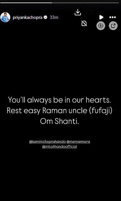 મંગળવારે પ્રિયંકાએ તેના સોશ્યલ મીડિયા હૅન્ડલ પર રમણરાય હાંડા માટે લાગણીભરી પોસ્ટ લખી હતી ઃ ‘તમે હંમેશાં અમારા દિલમાં રહેશો. શાંતિથી આરામ કરો, રમણઅંકલ (ફુફાજી). ઓમ શાંતિ.’ પ્રિયંકાએ આ પોસ્ટમાં મન્નારા, તેની બહેન મિતાલી અને તેમની મમ્મી કામિની ચોપડા હાંડાને પણ ટૅગ કર્યાં હતાં.