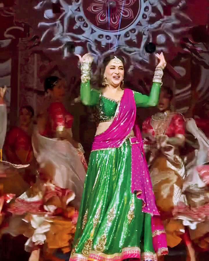 હાલમાં સોશ્યલ મીડિયામાં મેંદી ફંક્શનનો વિડિયો ચર્ચામાં છે જેમાં માધુરી દીક્ષિત ‘દેવદાસ’ના ગીત ‘ડોલા રે ડોલા’ પર ડાન્સ કરતી દેખાઈ રહી છે. માધુરીનો એનર્જેટિક પર્ફોર્મન્સ લોકોને બહુ પસંદ આવી રહ્યો છે. માધુરીએ ડાન્સ દરમ્યાન લીલા રંગનો લેહંગો અને સાથે ગુલાબી દુપટ્ટો પહેર્યો છે. માધુરીને આ ગીત પર ડાન્સ કરતી જોઈને ફૅન્સને માધુરી અને ઐશ્વર્યા રાયની મૂળ ગીતની કેમિસ્ટ્રી યાદ આવી ગઈ હતી. મેંદીના આ ફંક્શનને દિયા મિર્ઝાએ હોસ્ટ કર્યું હતું.
