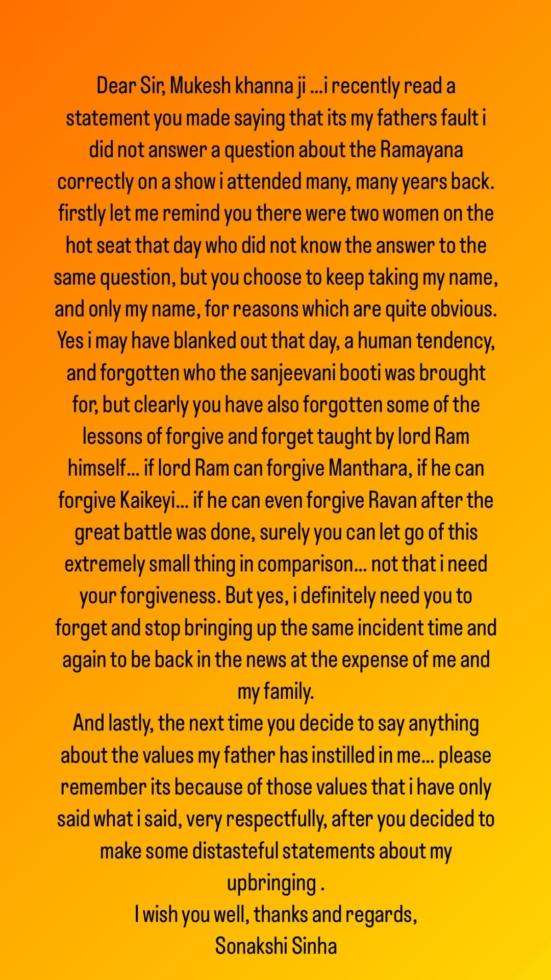 આના પર સોનાક્ષીએ લખ્યું હતું- ડિયર સર, મુકેશ ખન્ના જી... મેં તાજેતરમાં તમારું એક નિવેદન વાંચ્યું કે વર્ષો પહેલા એક શોમાં રામાયણ સાથે જોડાયેલા એક સવાલનો જવાબ ન આપી શક્યો તે મારા પિતાની ભૂલ હતી. હું તમને યાદ અપાવી દઉં કે તે દિવસે બે મહિલાઓ હોટ સીટ પર બેઠી હતી અને તેમને પણ જવાબ ખબર નહોતી. પણ તમે મારું નામ જ લેવાનું પસંદ કર્યું. ક્યારેક એવું બને છે કે તમે ખાલી જાવ છો. પરંતુ લાગે છે કે તમે ભગવાન રામના ક્ષમાનો પાઠ ભૂલી ગયા છો. તમે આ નાની નાની વાતોને ભૂલી જાવ. એક જ ઘટનાને વારંવાર સામે ન લાવો.