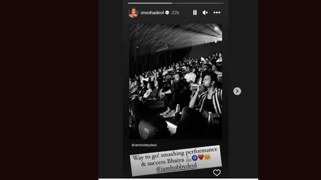 ઈશા દેઓલે તેના ઈન્સ્ટાગ્રામ પર એક ફોટો શેર કર્યો છે. આ સાથે, તેણે તેના કેપ્શનમાં `એનિમલ` ના તમામ કલાકારોને અભિનંદન આપ્યા. તેણે બોબી દેઓલ માટે લખ્યું, `શાનદાર પ્રદર્શન અને સફળતા, અભિનંદન ભાઈ`.