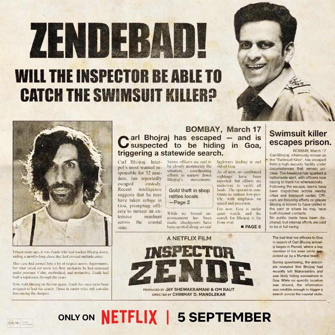 એક કુખ્યાત ‘સ્વિમસૂટ કિલર’ તિહાડ જેલમાંથી ફરાર થઈ જાય છે ત્યારે મુંબઈનો એક નીડર પોલીસ-ઇન્સ્પેક્ટર તેને પકડવાનું નક્કી કરે છે. આ પ્રયાસ એક રોમાંચક બિલાડી-ઉંદરની રમતમાં ફેરવાઈ જાય છે. રિયલ લાઇફમાં બિકિની કિલર તરીકે ઓળખાતા ચાર્લ્સ શોભરાજના દિલ્હીની તિહાડ જેલમાંથી ભાગી છૂટવા પછીના ઘટનાક્રમની સાચી ઘટનાથી પ્રેરિત ફિલ્મ ‘ઇન્સ્પેક્ટર ઝેન્ડે’ OTT પ્લૅટફૉર્મ નેટફ્લિક્સ પર પાંચમી સપ્ટેમ્બરે રિલીઝ થઈ રહી છે.