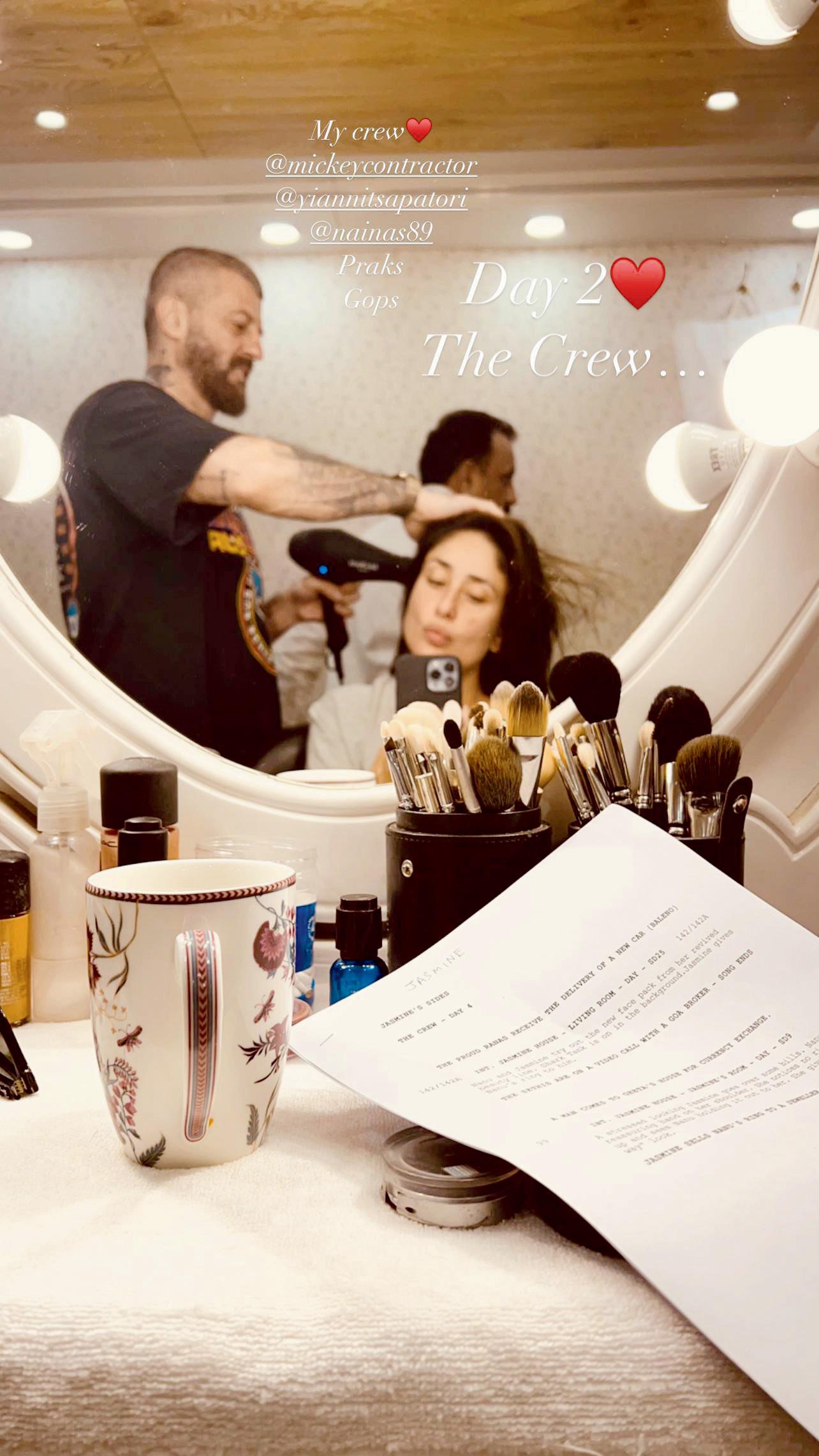 કરીના કપૂર ખાને હાલમાં જ ‘ધ ક્રૂ’નું શૂટિંગ શરૂ કરી દીધું છે. તેણે મેકઅપ રૂમમાંથી પોતાનો ફોટો શૅર કર્યો છે. ફોટોમાં તે મિરરની સામે બેઠી છે અને હેરસ્ટાઇલિસ્ટ તેના વાળને સ્પેશ્યલ લુક આપી રહ્યો છે. તેના ટેબલ પર કૉફી મગ અને સ્ક્રિપ્ટ દેખાય છે. આ ફિલ્મને રાજેશ ક્રિષ્નન ડિરેક્ટ કરી રહ્યો છે અને એકતા કપૂરે અને અનિલ કપૂરની દીકરી રિયા કપૂરે પ્રોડ્યુસ કરી છે. આ ફિલ્મમાં કરીનાની સાથે તબુ અને ક્રિતી સૅનન લીડ રોલમાં દેખાશે. મેકઅપ રૂમમાંથી પોતાનો ફોટો ઇન્સ્ટાસ્ટોરી પર શૅર કરીને કરીનાએ કૅપ્શન આપી હતી, ‘ધ ક્રૂ’નો બીજો દિવસ.