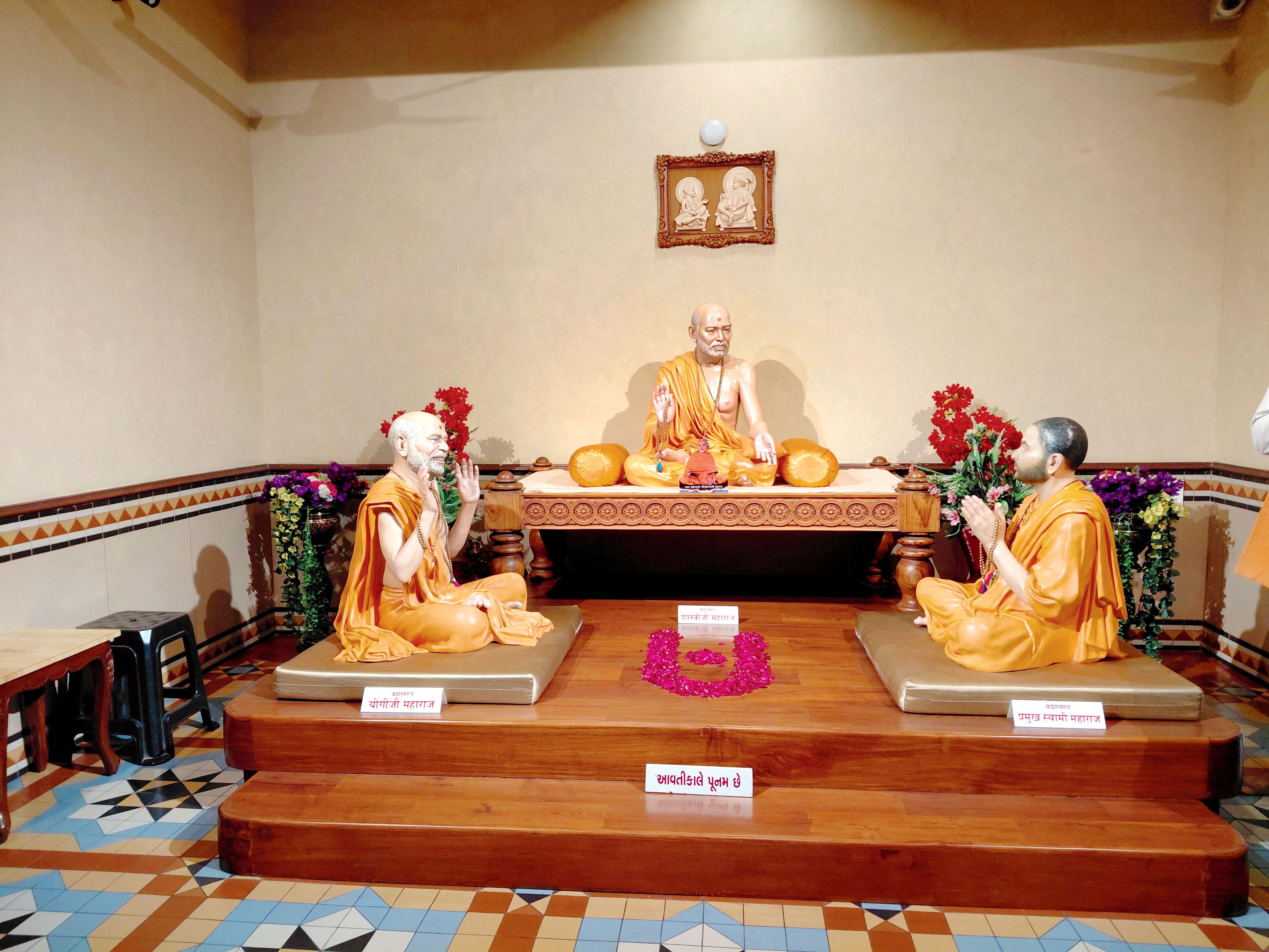 આંબલીવાળી પોળના જે ઘરમાં શાસ્ત્રીજી મહારાજ, પ્રમુખસ્વામી મહારાજ સહિત સંતપુરુષો રહેતા હતા એ ઘરમાં શાસ્ત્રીજી મહારાજ, યોગીજી મહારાજ અને પ્રમુખસ્વામી મહારાજની પ્રતિમા.