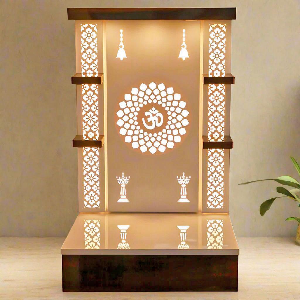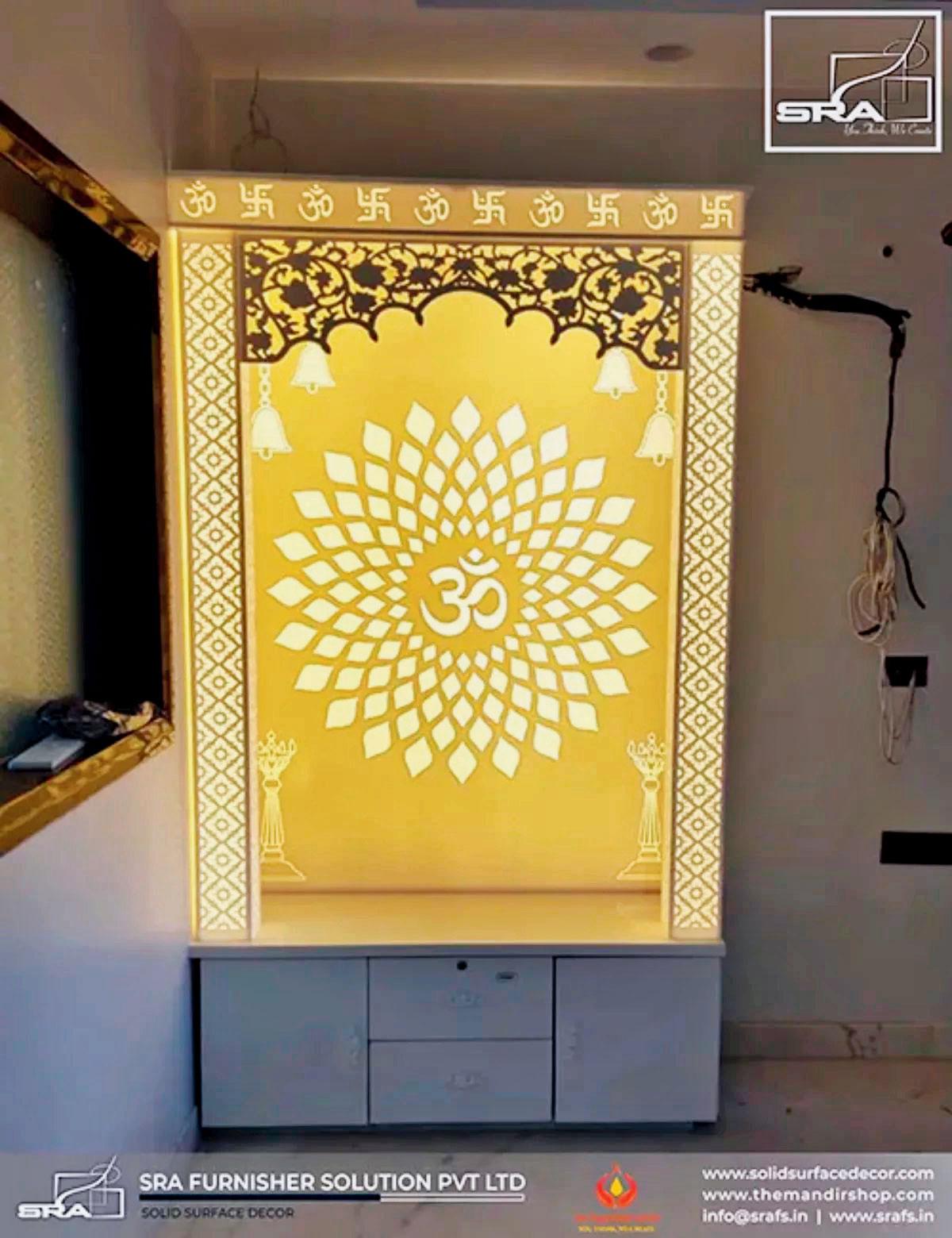મંદિરની દીવાલ પર મૉરક્કન જાળીવાળી પૅનલ્સ, લેઝરકટ ડિઝાઇન્સથી બનાવેલા બૅકડ્રૉપને લોકો વધુ પસંદ કરી રહ્યા છે. ડિઝાઇન્સની વચ્ચે ગણપતિબાપ્પાનું કટઆઉટ, સ્વસ્તિક, ઓમ અથવા શ્રી જેવાં આધ્યાત્મિક પ્રતીક કટઆઉટ કરાવે છે. વાઇટ અથવા ઑફવાઇટ કલરના સૉલિડ ઍક્રિલિક બેઝ પર કટઆઉટ વર્ક અત્યારે સૌથી વધારે ટ્રેન્ડિંગ છે. દીવા અને અગરબત્તીના ધુમાડાને લીધે મંદિરમાં કાળાશ જમા થાય છે એ સહેલાઈથી સાફ થાય એવા મટીરિયલનો યુઝ વધ્યો છે; કારણ કે રેડીમેડ મંદિર હોય તો એને બદલી શકાય, ઘરમાં બનાવેલું મંદિર વારંવાર બદલી શકાય નહીં. તેથી સમજી-વિચારીને ઇન્ટીરિયર એક્સપર્ટની સલાહ લઈને પછી જ મંદિર બનાવવું જોઈએ.