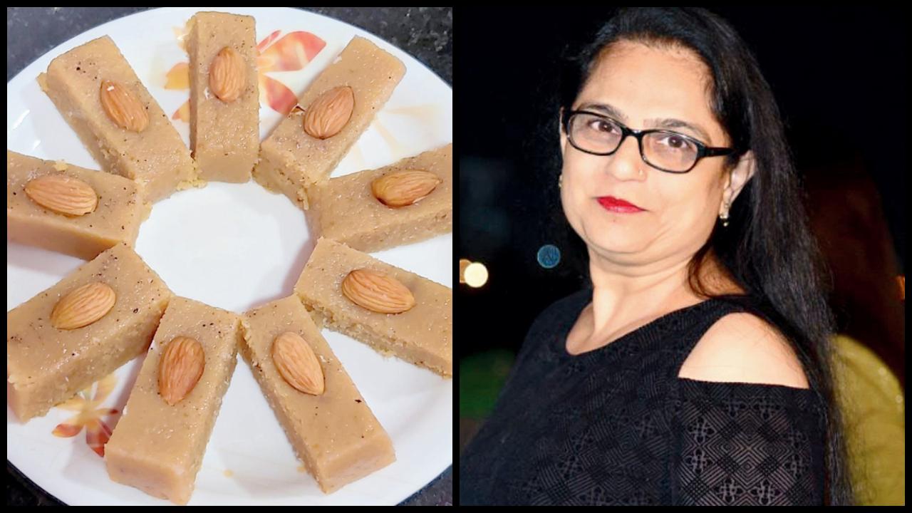 પાથરીને ઠંડું પડવા દો. ઇચ્છો તો ફ્રિજમાં મૂકી શકો છો. બદામથી ડેકોરેટ કરી સર્વ કરો.