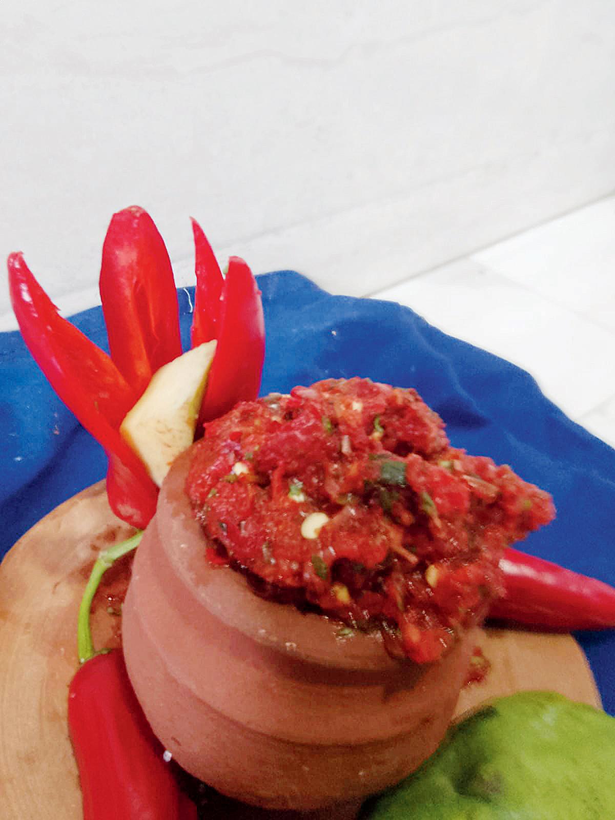 સામગ્રી: ૪-૫ સીઝનલ લાલ મરચાં લેવાં, એક ચમચી થાય એટલું સૂકું લસણ, એક ટુકડો આદું, અડધી વાટકી દાંડાવાળી કોથમીર, અડધી વાટકી સમારેલી કાચી કેરી, મીઠું સ્વાદ પ્રમાણે.