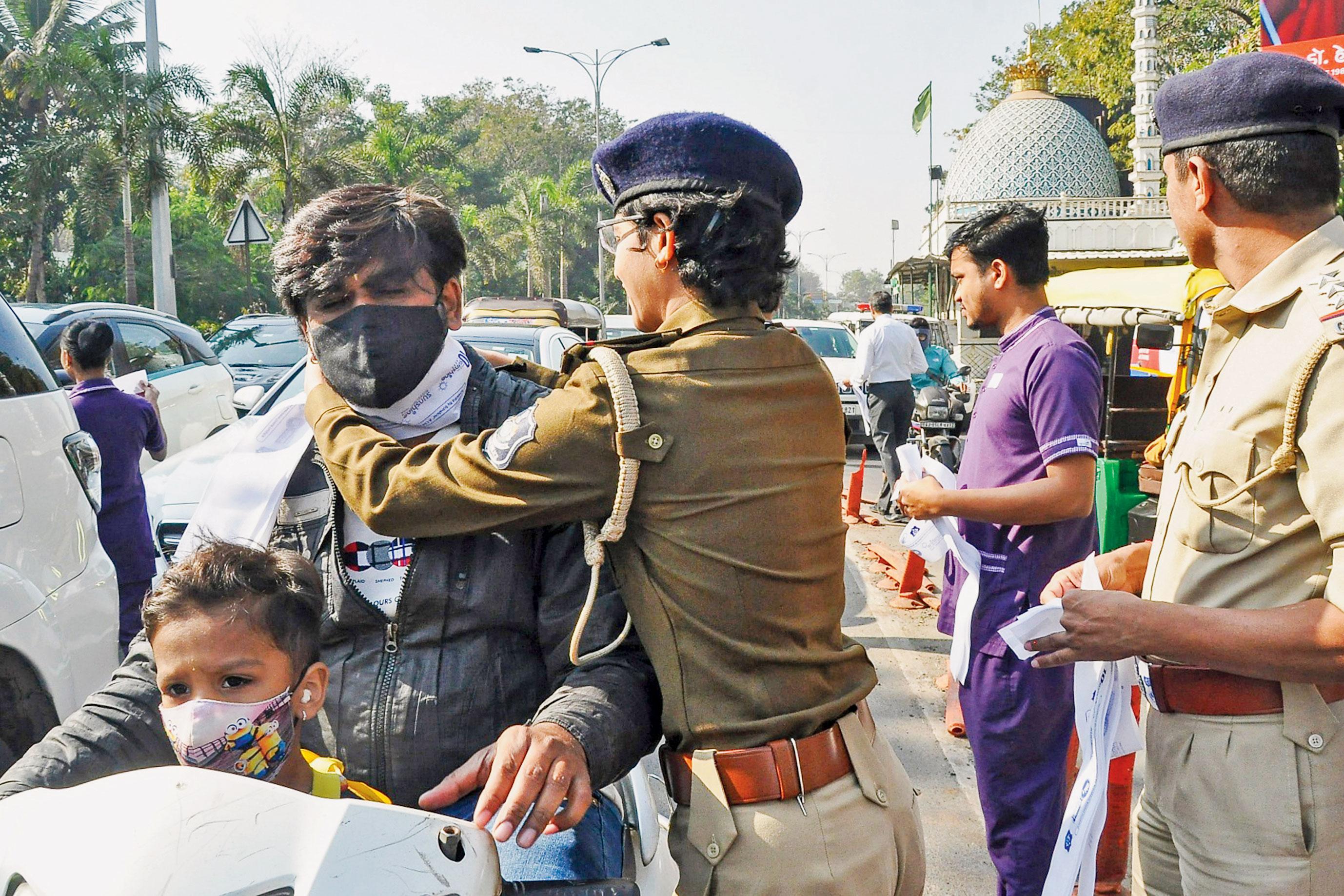 સુરતમાં જીવલેણ ચાઇનીઝ માંજાથી ટૂ-વ્હીલર ચલાવતા લોકોને બચાવવા ટ્રાફિક-પોલીસ ગઈ કાલે તેમને ગળામાં પહેરવા માટે સ્કાર્ફનું વિતરણ કરતી દેખાઈ હતી.