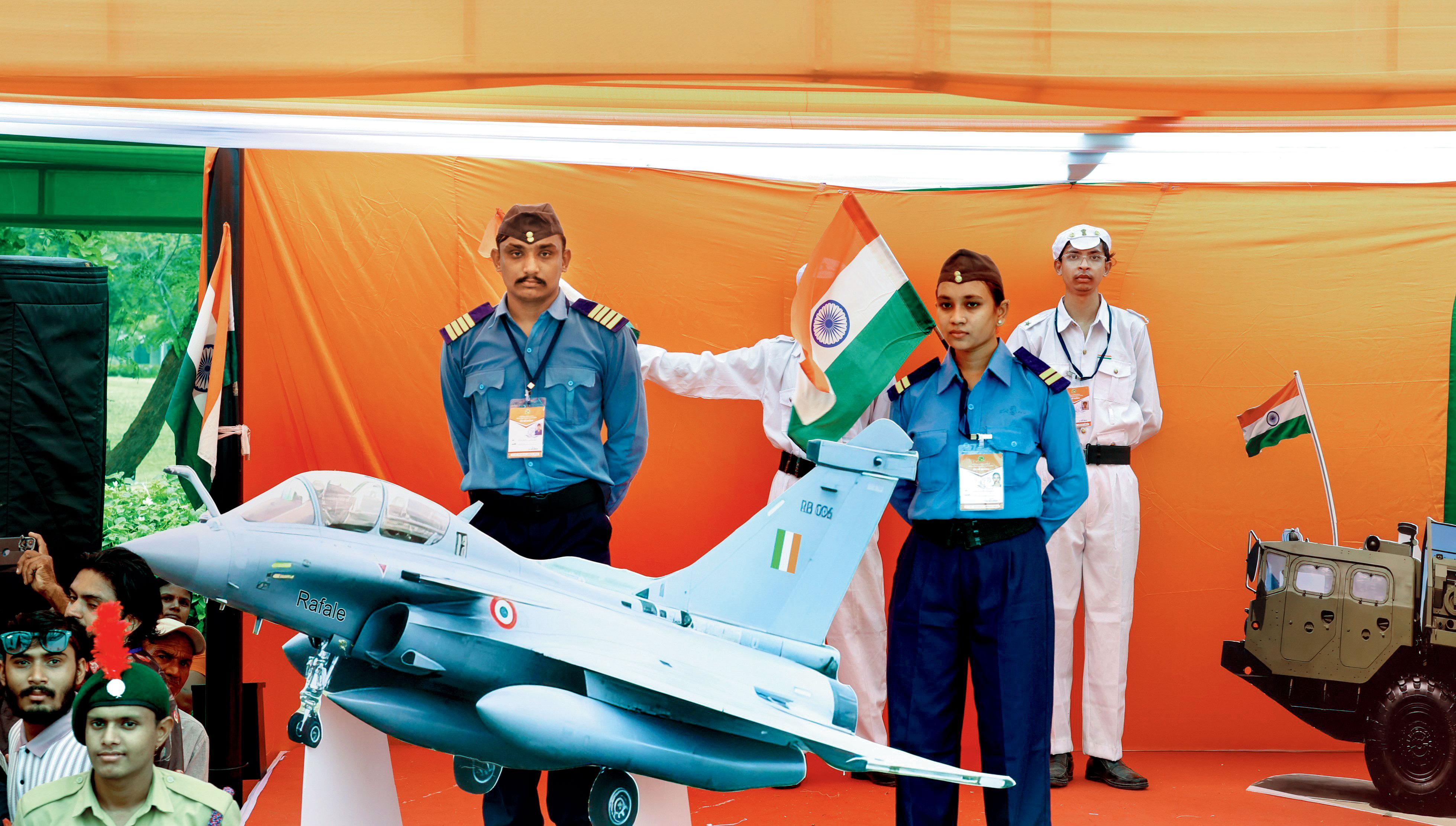 રફાલ વિમાન સહિતનાં સેનાનાં યુદ્ધ-જહાજો અને શસ્ત્રોની પ્રતિકૃતિ મુકાઈ હતી.