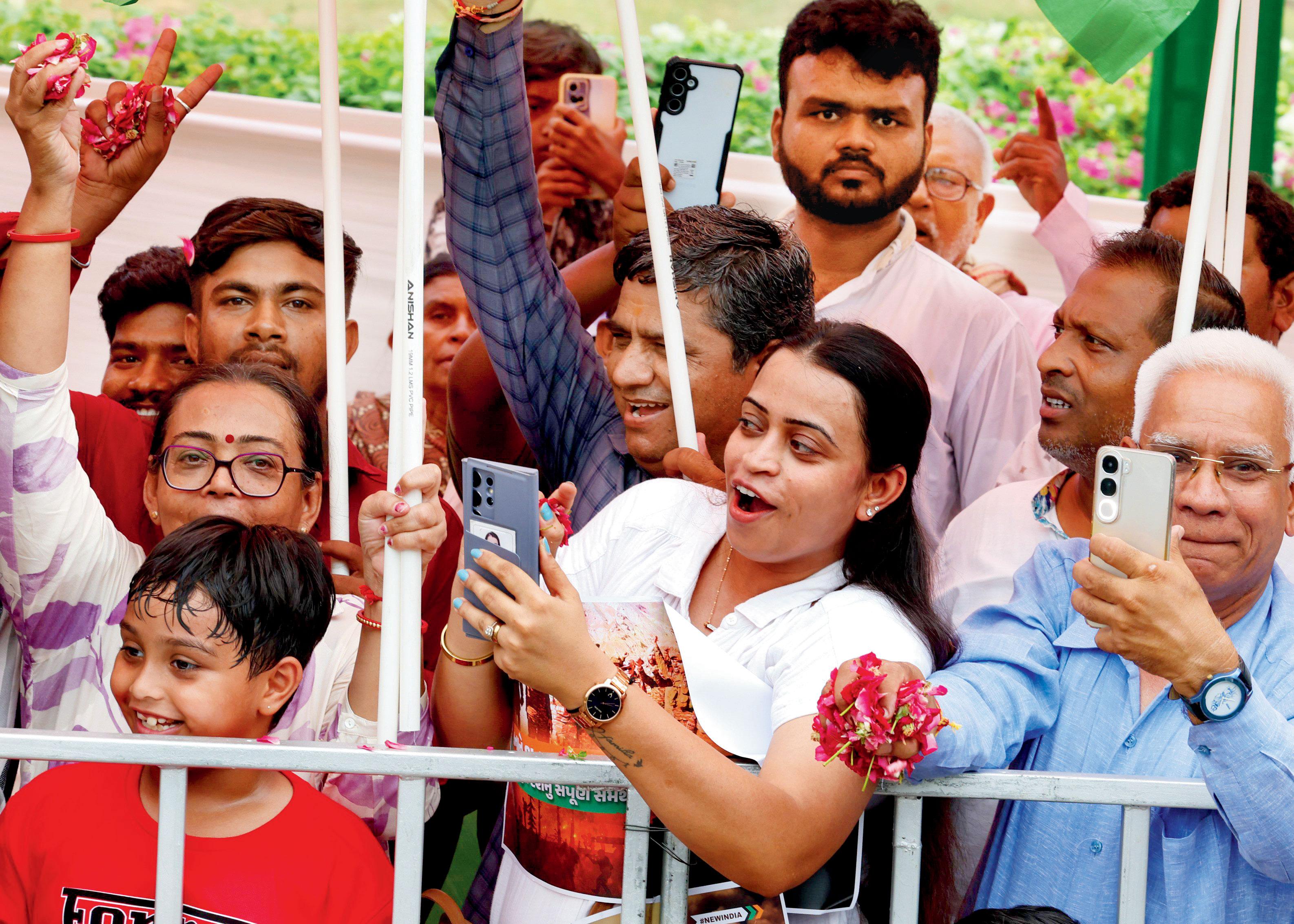 ઑપરેશન સિંદૂર દ્વારા ભારતે પાકિસ્તાનને પછાડ્યા બાદ પહેલી વાર દેશના વડા પ્રધાન નરેન્દ્ર મોદી ગાંધીનગર આવતાં ગઈ કાલે યોજાયેલા રોડ-શોમાં જાણે કે ગાંધીનગરમાં ૧૫ ઑગસ્ટ અને ૨૬ જાન્યુઆરીની ઉજવણી થતી હોય એવા દેશભક્તિના માહોલ સાથે ઑપરેશન સિંદૂરની સફળતાને લોકોએ વધાવી હતી અને નરેન્દ્ર મોદી પર પુષ્પોની વર્ષા કરીને જનજને તેમનું અભિવાદન કરીને આવકાર્યા હતા. એટલું જ નહીં, એકસાથે એક જ રૂટ પર દોઢથી બે કિલોમીટર સુધી હજારોની સંખ્યામાં લોકોએ સેનાના સન્માનમાં નરેન્દ્ર મોદી સામે તિરંગો લહેરાવી પોતાની લાગણી વ્યક્ત કરવાની સુખદ ઘટના બની હતી.