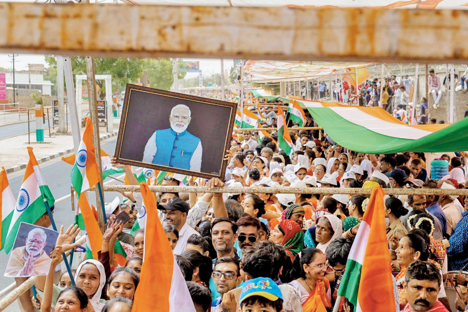 ભુજના રોડ-શોમાં ઊમટેલા કચ્છી માડુંઓ અને તસવીરમાં ઉપર એક કિલોમીટર લાંબો તિરંગો દેખાય છે.