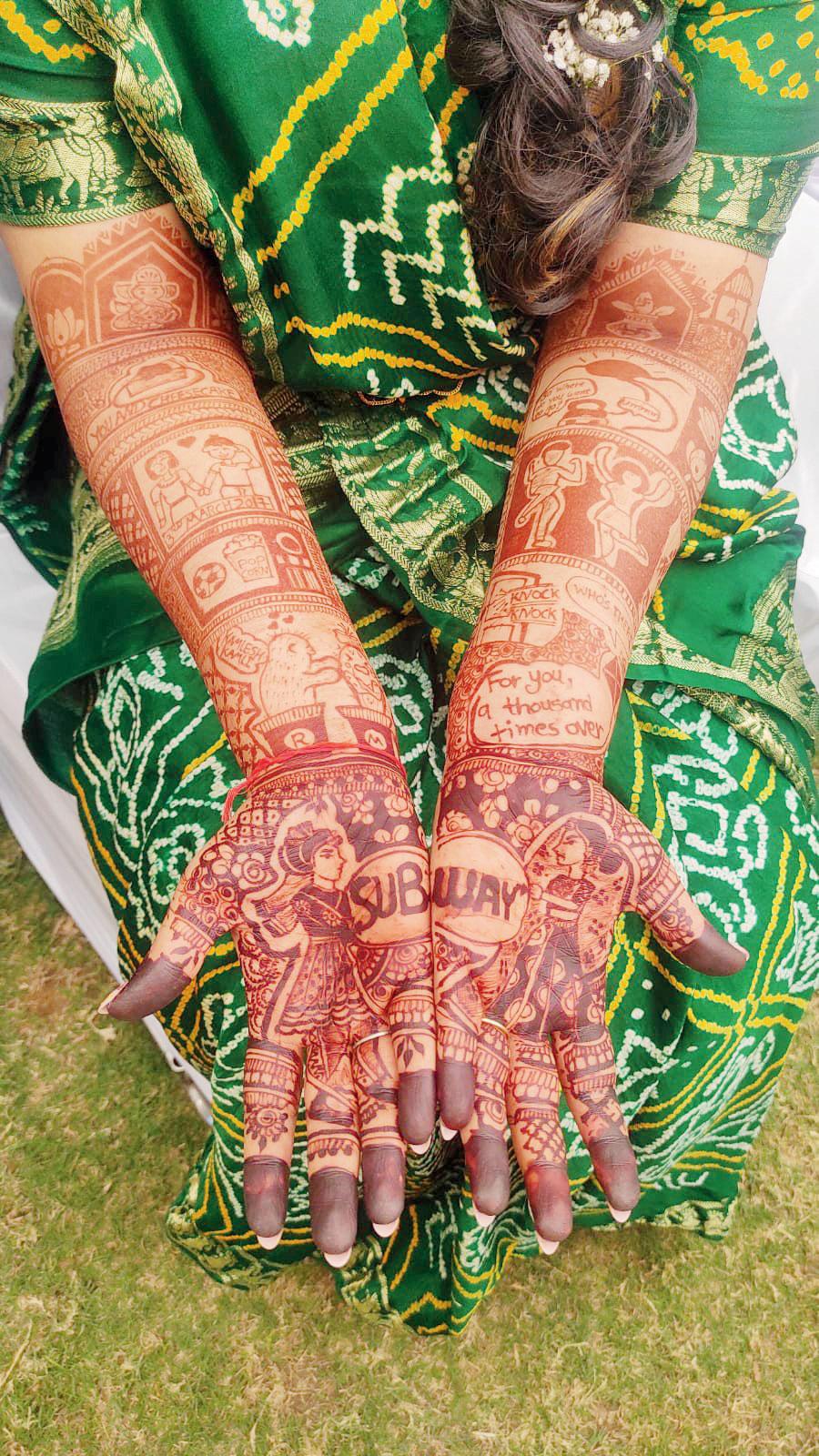 જનરલી છોકરીઓનાં લગ્નની મેંદીમાં નવવધૂ, વરરાજા, ઢોલ, શરણાઈ, મોર, કમળ જેવી ડિઝાઇનો મૂકવામાં આવે છે; પણ એમબીએ થયેલી માન્યતાએ પોતાની હથેળીમાં ચીઝ કેક, સમાન શોખ, ફેવરિટ ક્વોટ, ફૂડ-જોઇન્ટનું નામ, કેક્ટ્સની જોડી જેવી અનયુઝઅલ ડિઝાઇન કરાવી છે. આ આઇડિયા કઈ રીતે આવ્યો? એના જવાબમાં કોકા કોલા કંપનીમાં માર્કેટિંગ હેડ તરીકે કાર્યરત માન્યતા ‘મિડ-ડે’ને કહે છે, ‘ગયા સન્ડે જ મને વિચાર આવ્યો કે હું યુઝઅલ મેંદીને બદલે કંઈ ક્રીએટિવ કરું. એ વિચાર પર વિસ્તારથી વિચાર કરતાં નક્કી કર્યું કે એમાં મારી અને રથિનની લવસ્ટોરીની જ કથા આલેખું. અમારી પ્રણયકથાના મહત્ત્વના પ્રસંગો શૉર્ટઆઉટ કર્યા અને એમાંથી મેં આઠ એલિમેન્ટ્સ સિલેક્ટ કર્યાં. પછી એને પ્રેઝન્ટ કરતાં પ્રૉપર કૅરિકેચર તૈયાર કર્યાં અને એ કૅરિકેચર મેંદી મૂકતાં બહેનને આપ્યાં.’