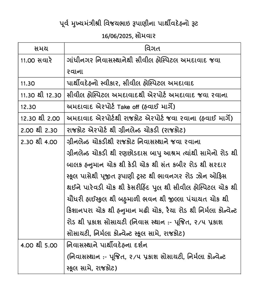 પ્લેન-ક્રૅશની ભયાનકતાને જોતાં સ્વાભાવિકપણે વિજયભાઈના પાર્થિવ દેહને પુષ્પથી ઢાંકી રાખવામાં આવશે. પાંચ વાગ્યે દર્શન પૂર્ણ થયા પછી પાર્થિવ દેહને અંતિમ સંસ્કાર માટે રાજકોટના રામનાથ પરા સ્મશાનગૃહમાં લઈ જવામાં આવશે.