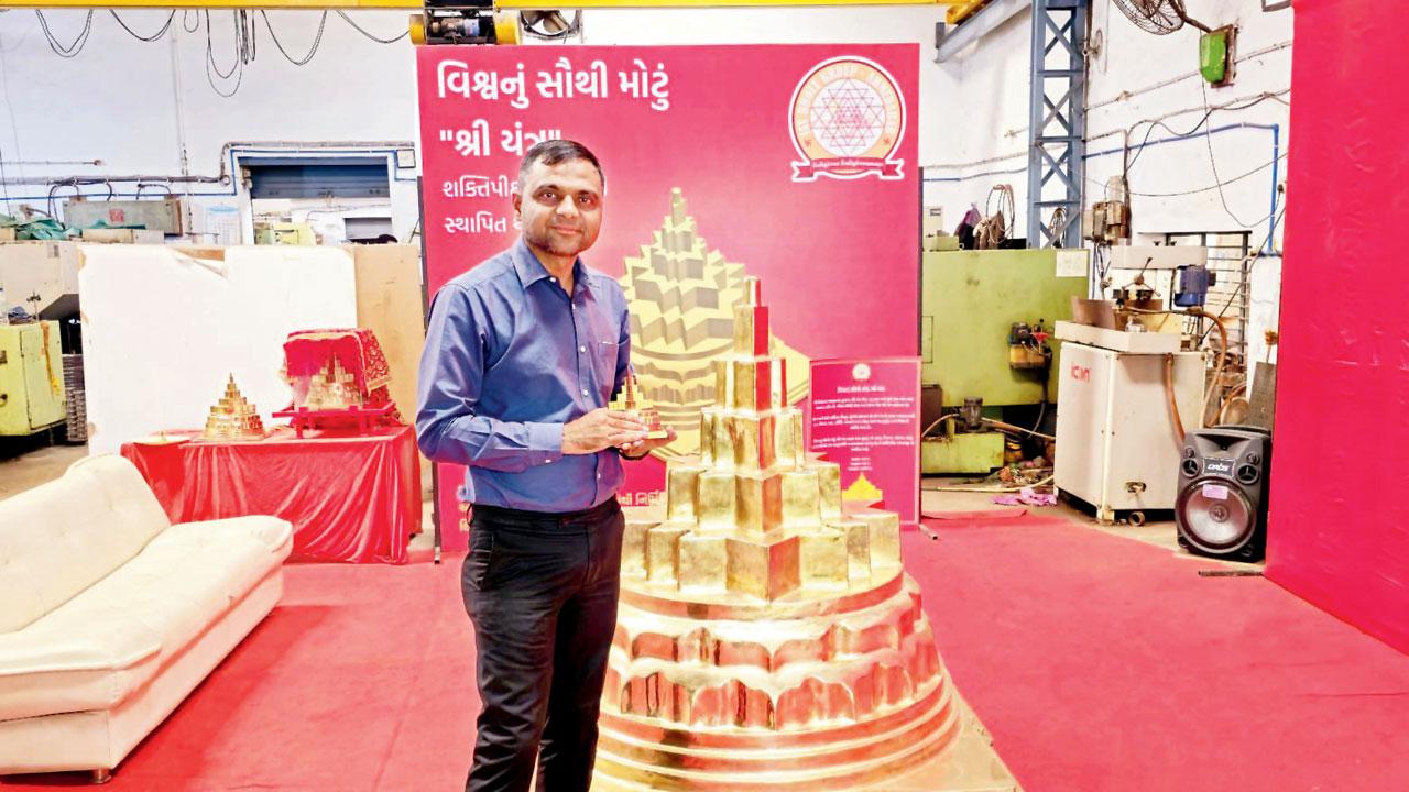 સૌથી મોટા શ્રીયંત્ર પાસે હાથમાં શ્રીયંત્રની પ્રતિકૃતિ સાથે દીપેશ પટેલ