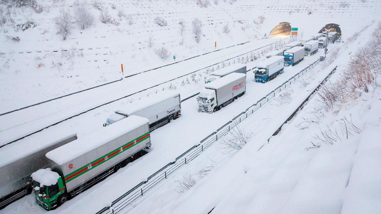 જપાનમાં આજકાલ ભારે હિમવર્ષા થઈ રહી છે. મંગળવારે થયેલી હિમવર્ષાએ છેલ્લાં ૧૦ વર્ષનાે રેકૉર્ડ તોડ્યો હતો. પરિણામે વાહનવ્યવહાર પર વિપરીત અસર પડી હતી. ગઈ કાલે જપાનના યોકાઇચીમાં હાઇવે પર બરફમાં ફસાયેલી ટ્રકો. તસવીર : એ.એફ.પી.