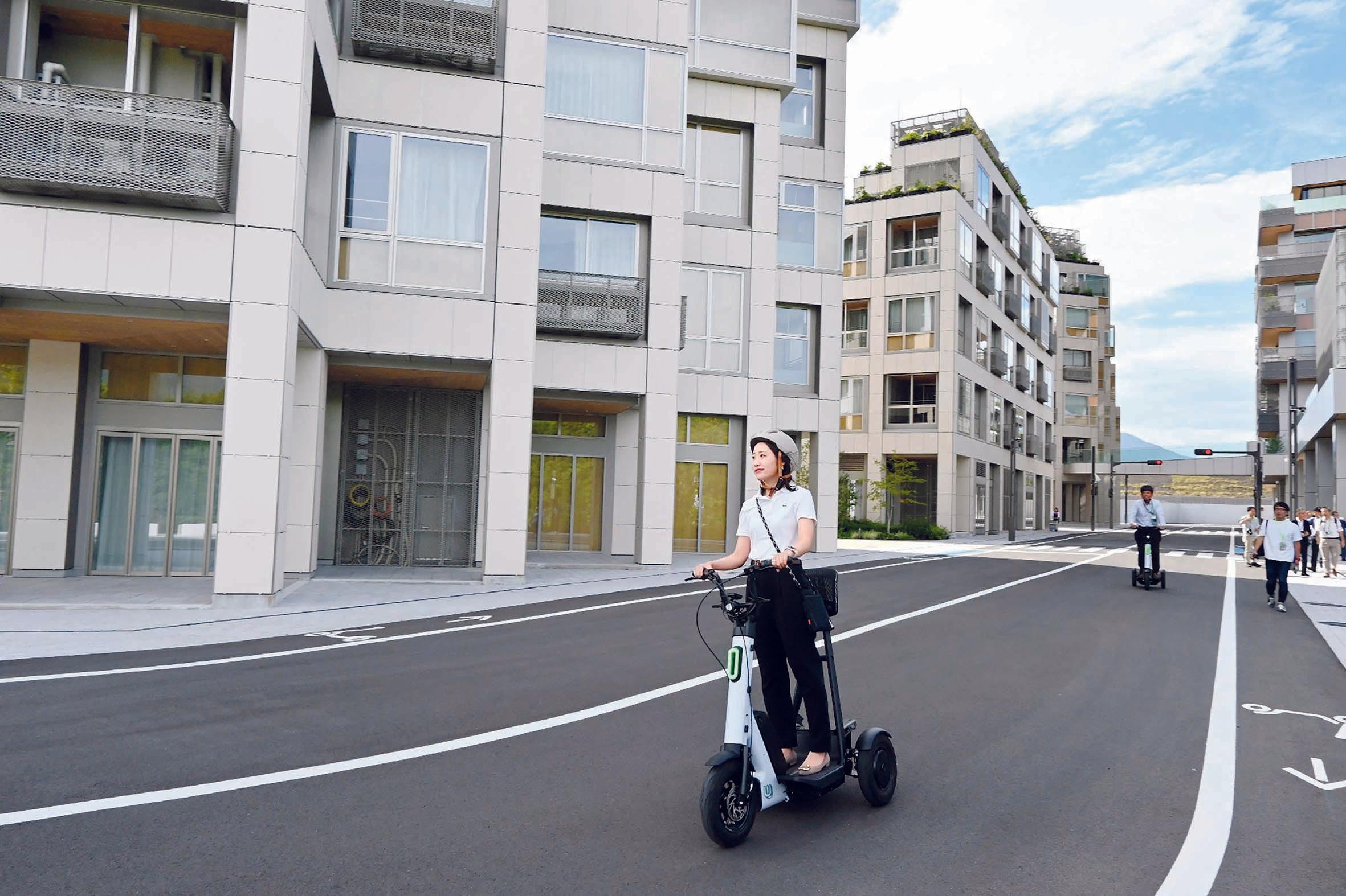 હાઈ-ટેક વિલેજમાં થ્રી-વ્હીલ્ડ મોબિલિટી સ્કૂટર.