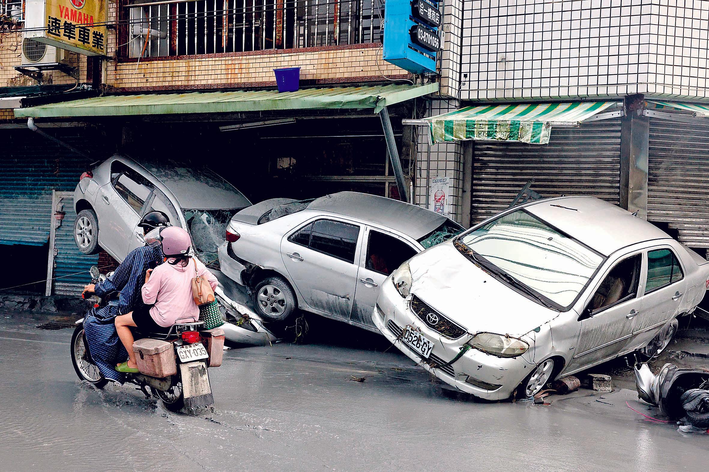 તાઇવાનમાં વાવાઝોડાને લીધે આવેલા પૂરમાં તણાઈ ગયેલાં વાહનો.