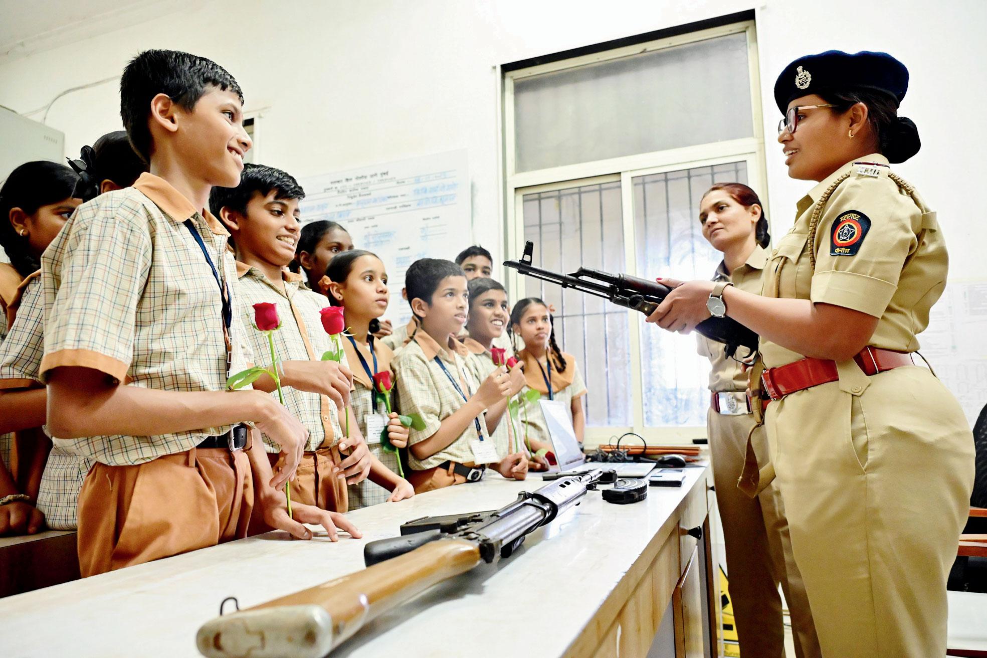 મહારાષ્ટ્ર પોલીસના ફાઉન્ડેશન ડે નિમિત્તે ગઈ કાલે મલબાર હિલ પોલીસ-સ્ટેશનમાં BMCની સ્કૂલના વિદ્યાર્થીઓને શસ્ત્રો કઈ રીતે ચલાવવાં એની ટ્રેઇનિંગ આપવાની સાથે ગુડ ટચ, બૅડ ટચ કોને કહેવાય અને એ કઈ રીતે ઓળખી શકાય એની માહિતી આપવામાં આવી હતી. (તસવીર - શાદાબ ખાન)