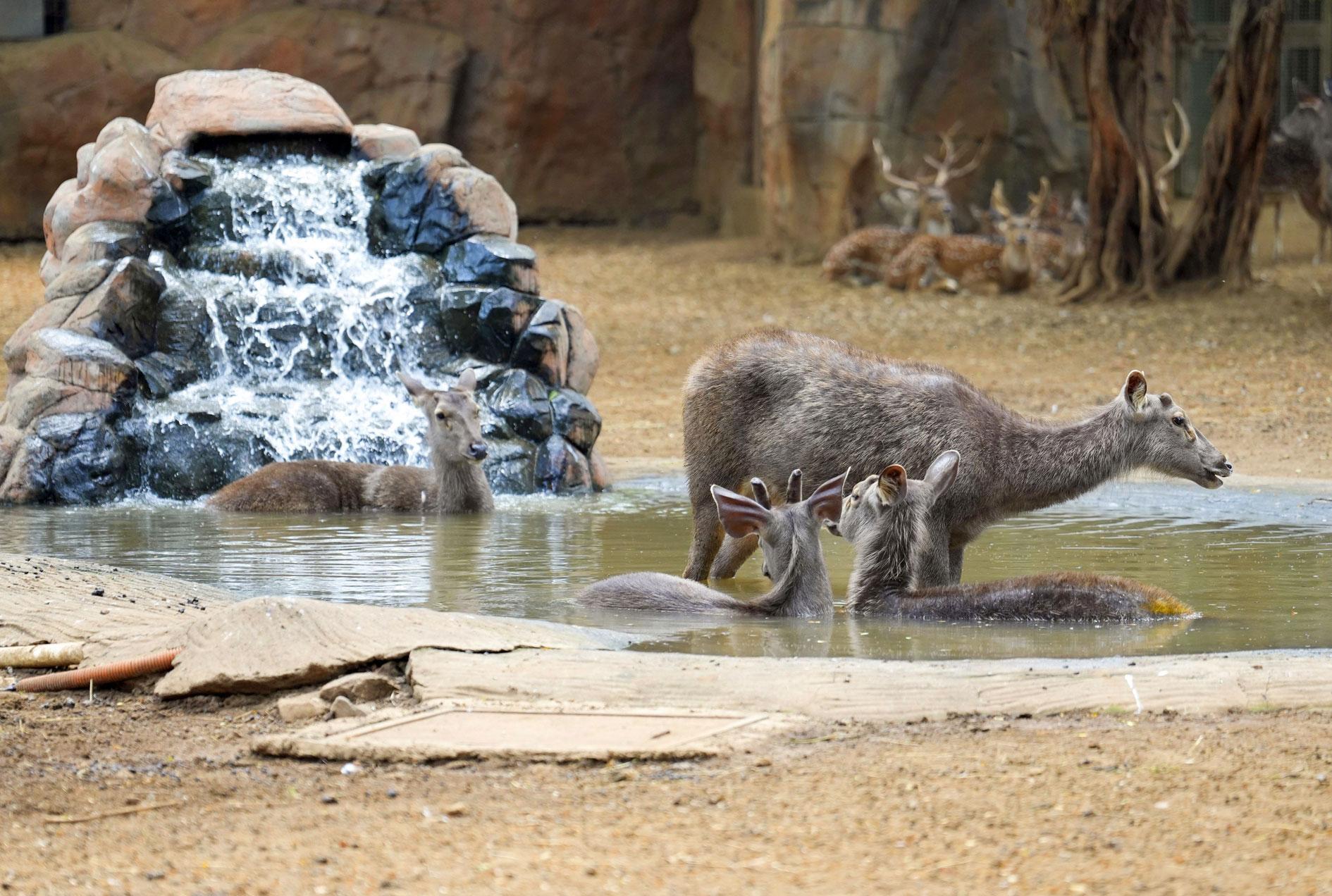 ઉનાળો આગળ વધવાની સાથે ગરમીમાં સતત વધારો થઈ રહ્યો છે એને લીધે મુંબઈગરાઓની સાથે પ્રાણીઓ પણ હેરાન થઈ રહ્યાં છે. ભાયખલામાં આવેલા રાણીબાગમાં રાખવામાં આવેલાં પ્રાણીઓને ગરમીથી રાહત મળે એ માટેના પ્રયાસરૂપે અહીંના સંચાલકોએ પાણીના ફાઉન્ટનની વ્યવસ્થા કરી છે. એની નીચે ગઈ કાલે સાંભર અને હરણ ગરમીથી રાહત અનુભવતાં જોવા મળ્યાં હતાં.