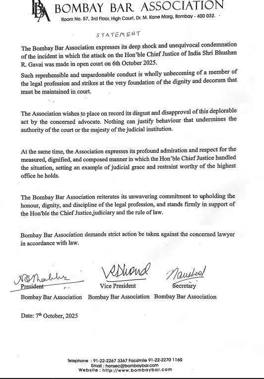 બૉમ્બે બાર અસોસિએશને (Bombay Bar Association) ૬ઠી ઓક્ટોબર, ૨૦૨૫ના રોજ ભરઅદાલતમાં ભારતના સન્માનીય મુખ્ય ન્યાયાધીશ શ્રી ભૂષણ આર. ગવઈ પર થયેલા હુમલાની ઘટના અંગે ઊંડો આઘાત અને સ્પષ્ટ નિંદા વ્યક્ત કરીએ છીએ. આ પ્રકારનું નિંદનીય અને અક્ષમ્ય વર્તન કાયદાકીય વ્યવસાયના સભ્ય માટે સંપૂર્ણપણે અશોભનીય છે તેમજ અદાલતમાં જે ગરિમા અને શિષ્ટાચાર જાળવવો જોઈએ તેના પાયા પર પ્રહાર કર્યા સમાન છે. અસોસિએશન આવું કૃત્ય કરનાર વકીલના નિંદનીય કૃત્ય પ્રત્યે તેની નારાજગી દર્શાવે છે. અદાલતની સત્તા કે ન્યાયિક સંસ્થાની ભવ્યતાને નબળી પાડતી આ પ્રકારની વર્તણૂક જરાય યોગ્ય નથી. આ સાથે જ અસોસિએશન માનનીય મુખ્ય ન્યાયાધીશે જે રીતે પરિસ્થિતિને જાળવી લીધી તેની પ્રશંસા કરે છે અને આદર વ્યક્ત કરે છે, જે સર્વોચ્ચ હોદ્દાને લાયક ન્યાયિક કૃપા અને સંયમનું ઉદાહરણ છે. બૉમ્બે બાર અસોસિએશન (Bombay Bar Association) કાનૂની વ્યવસાયના સન્માન, ગૌરવ અને શિસ્તને જાળવી રાખવા માટે તેની અતૂટ પ્રતિબદ્ધતાને દોહરાવે છે. તેમ જ માનનીય મુખ્ય ન્યાયાધીશ, ન્યાયતંત્ર અને કાયદાના શાસનના સમર્થનમાં નિશ્ચિતપણે ઊભું છે. બૉમ્બે બાર અસોસિએશન કાયદા અનુસાર સંબંધિત વકીલ સામે કડક કાર્યવાહી કરવાની માગ કરે છે.