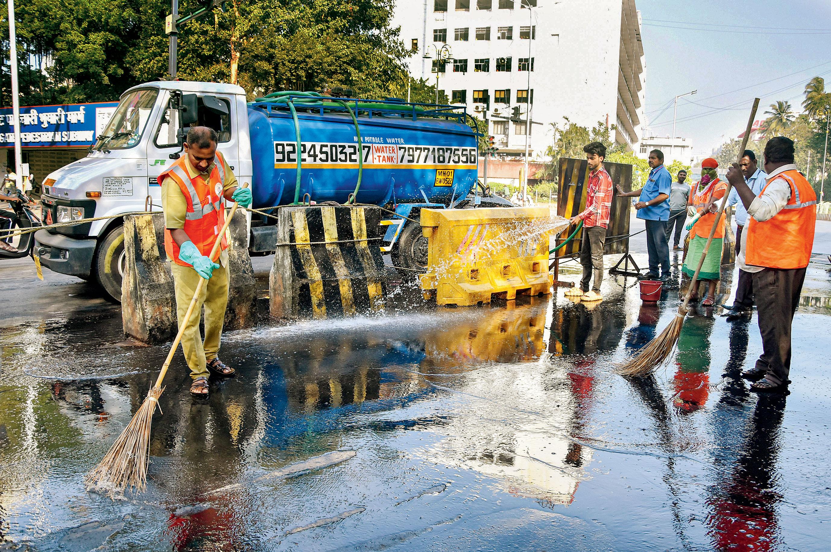 ગઈ કાલે ચર્ચગેટમાં BMCના કર્મચારીઓ રસ્તા ધોઈ રહ્યા હતા.