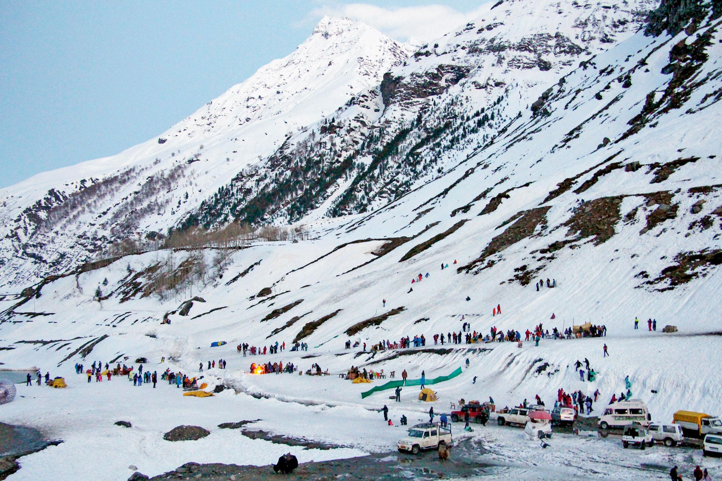 ગઈ કાલે હિમાચલ પ્રદેશના લાહૌલ-સ્પીતિમાં અટલ ટનલ પાસે બરફાચ્છાદિત વિસ્તારમાં સ્નોની મજા માણતા ટૂરિસ્ટો.