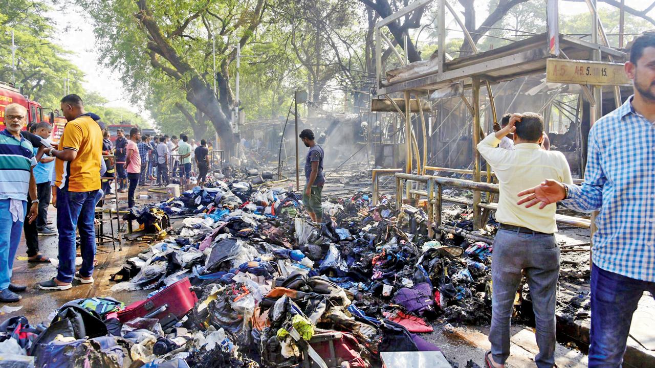 ચર્ચગેટમાં આવેલી ફૅશન સ્ટ્રીટમાં ગઈ કાલે લાગેલી આગમાં સળગી ગયેલી દુુકાનો અને આગ ઓલવી રહેલા ફાયર બ્રિગેડના જવાનો. (તસવીર : અતુલ કાંબળે)