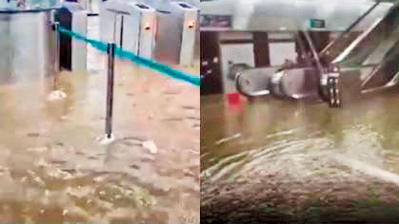 મેટ્રો લાઇન ૩ના વરલી પાસેના આચાર્ય અત્રે ચોક સ્ટેશનમાં વરસાદનું પાણી ભરાઈ ગયું