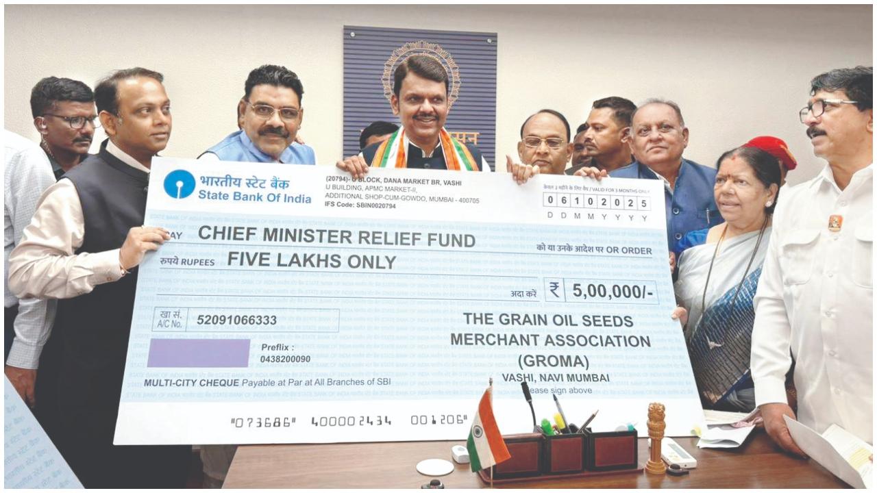 મહારાષ્ટ્રમાં ભારે વરસાદને લીધે આવેલાં પૂરમાં ભારે તારાજી સર્જાઈ હતી. વરસાદને લીધે સામાન્ય જનતા સાથે ખેડૂતોને પણ ભારે નુકસાન થયું છે. આવા સંજોગોમાં અસરગ્રસ્તોને સહાયરૂપ થવા માટે ગઈ કાલે ગ્રેન રાઇસ ઍન્ડ ઑઇલસીડ્સ મર્ચન્ટ્સ અસોસિએશન (GROMA - ગ્રોમા) તરફથી મહારાષ્ટ્રના ચીફ મિનિસ્ટરને પૂર રાહત ફન્ડમાં પાંચ લાખ રૂપિયાનું ડોનેશન આપવામાં આવ્યું હતું. દેવેન્દ્ર ફડણવીસને ચેક આપી રહેલાં સ્થાનિક વિધાનસભ્ય મંદાતાઈ મ્હાત્રે અને તેમની સાથે શરદ સોનાવણે, ગ્રોમાના પ્રમુખ ભીમજી ભાનુશાલી, ઉપપ્રમુખ અમૃતલાલ જૈન અને સેક્રેટરી તેમ જ APMCના ડિરેક્ટર નીલેશ વીરા હાજર હતા.