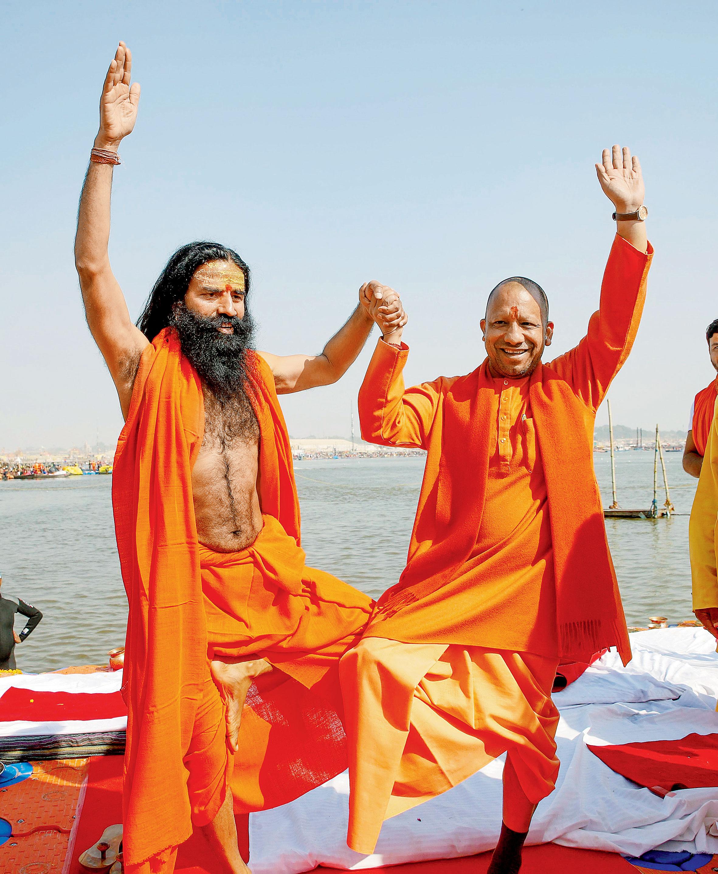 ગઈ કાલે મહાકુંભમાં સંગમ તટ પર યોગાસન કરતા ઉત્તર પ્રદેશના મુખ્ય પ્રધાન યોગી આદિત્યનાથ અને યોગગુરુ બાબા રામદેવ.