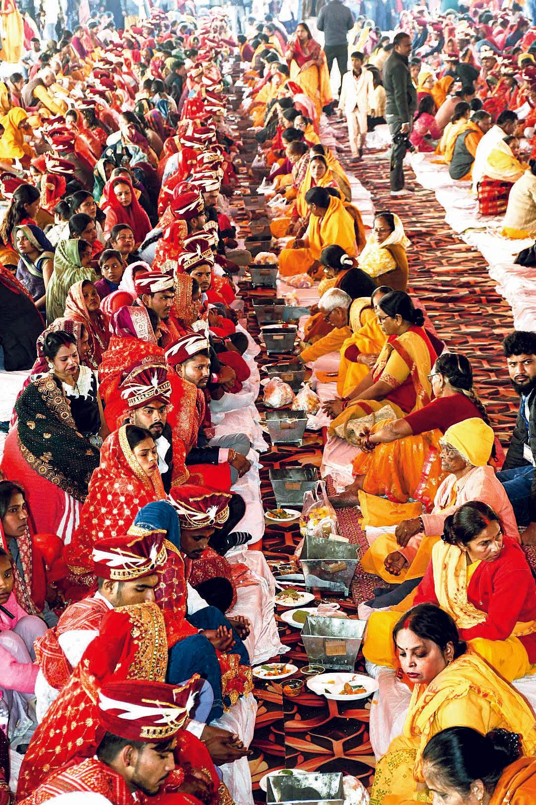 કાનપુરના ચંદ્રશેખર આઝાદ કૃષિ અને પ્રાદ્યોગિકી વિશ્વવિદ્યાલયના મેદાનમાં ગુરુવારે લગ્નની સામૂહિક શરણાઈઓ ગુંજી ઊઠી હતી. અહીં ચોતરફ જ્યાં જુઓ ત્યાં દુલ્હાઓ અને દુલ્હનો જ નજરે પડતાં હતાં. મુખ્ય પ્રધાન સામૂહિક વિવાહ યોજના અંતર્ગત યોજાયેલા આ સમારંભમાં કુલ ૬૩૫ યુગલો લગ્નગ્રંથિથી જોડાયાં હતાં. આવાં સામૂહિક આયોજનોમાં નકલી દુલ્હા-દુલ્હનો અને ગોટાળાઓ ન થાય એ માટે સરકારે બાયોમેટ્રિક ફેસ રેકગ્નિશન સિસ્ટમથી યુગલોને વેરિફાય કર્યાં હતાં.
