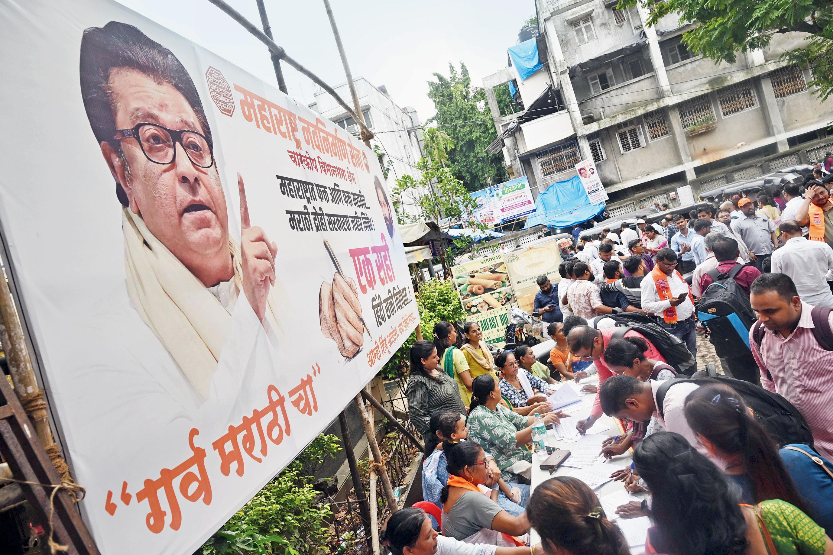 ગઈ કાલે કાંદિવલી-વેસ્ટમાં રેલવે-સ્ટેશનની બહાર હિન્દીના વિરોધમાં લોકોની સિગ્નેચર ભેગી કરતા મહારાષ્ટ્ર નવનિર્માણ સેનાના કાર્યકરો. તસવીર : સતેજ શિંદે
