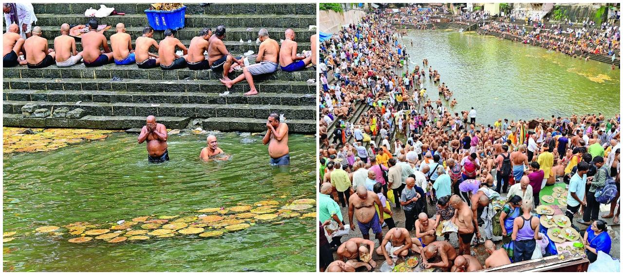 સનાતન ધર્મમાં શ્રાદ્ધપક્ષમાં પિતૃતર્પણનો મહિમા હોય છે. ગઈ કાલે ભાદરવી અમાસ હતી. જે શ્રાદ્ધપક્ષનો અંતિમ દિવસ હતો. એને સર્વપિતૃ અમાસ પણ કહેવામાં આવે છે. ગઈ કાલે મુંબઈના વાલકેશ્વરના પવિત્ર એવા બાણગંગા તળાવના કાંઠે પિતૃતર્પણની વિધિ કરી સેંકડો શ્રદ્ધાળુઓએ તળાવમાં ડૂબકી લગાવી હતી. અનેક લોકોએ તેમના પિતૃઓને યાદ કરી તેમની સદ્ગતિ માટે પ્રાર્થના કરી હતી અને તેમના આશીર્વાદ મેળવવા શ્રદ્ધાપૂર્વક શ્રાદ્ધવિધિ કરી મુંડન પણ કરાવ્યું હતું. તસવીરો : શાદાબ ખાન