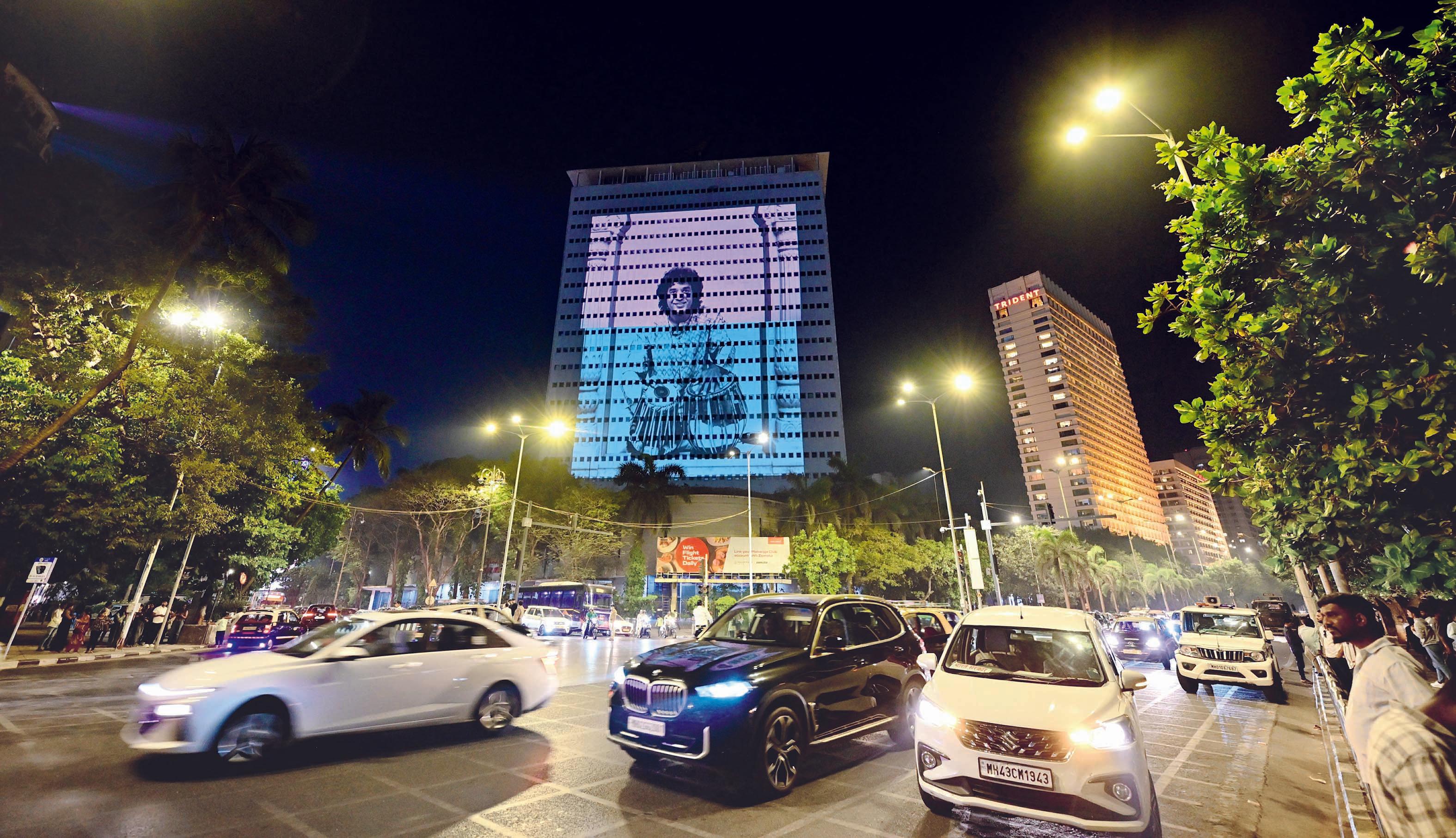 મહાન તબલાવાદક ઝાકિર હુસેનની આજે પ્રથમ પુણ્યતિથિ છે એ નિમિત્તે ગઈ કાલે એની પૂર્વસંધ્યાએ નરીમાન પૉઇન્ટ પરના ઍર ઇન્ડિયા બિલ્ડિંગ પર તેમને યાદ કરતું પ્રોજેક્શન કરવામાં આવ્યું હતું. તસવીર : શાદાબ ખાન